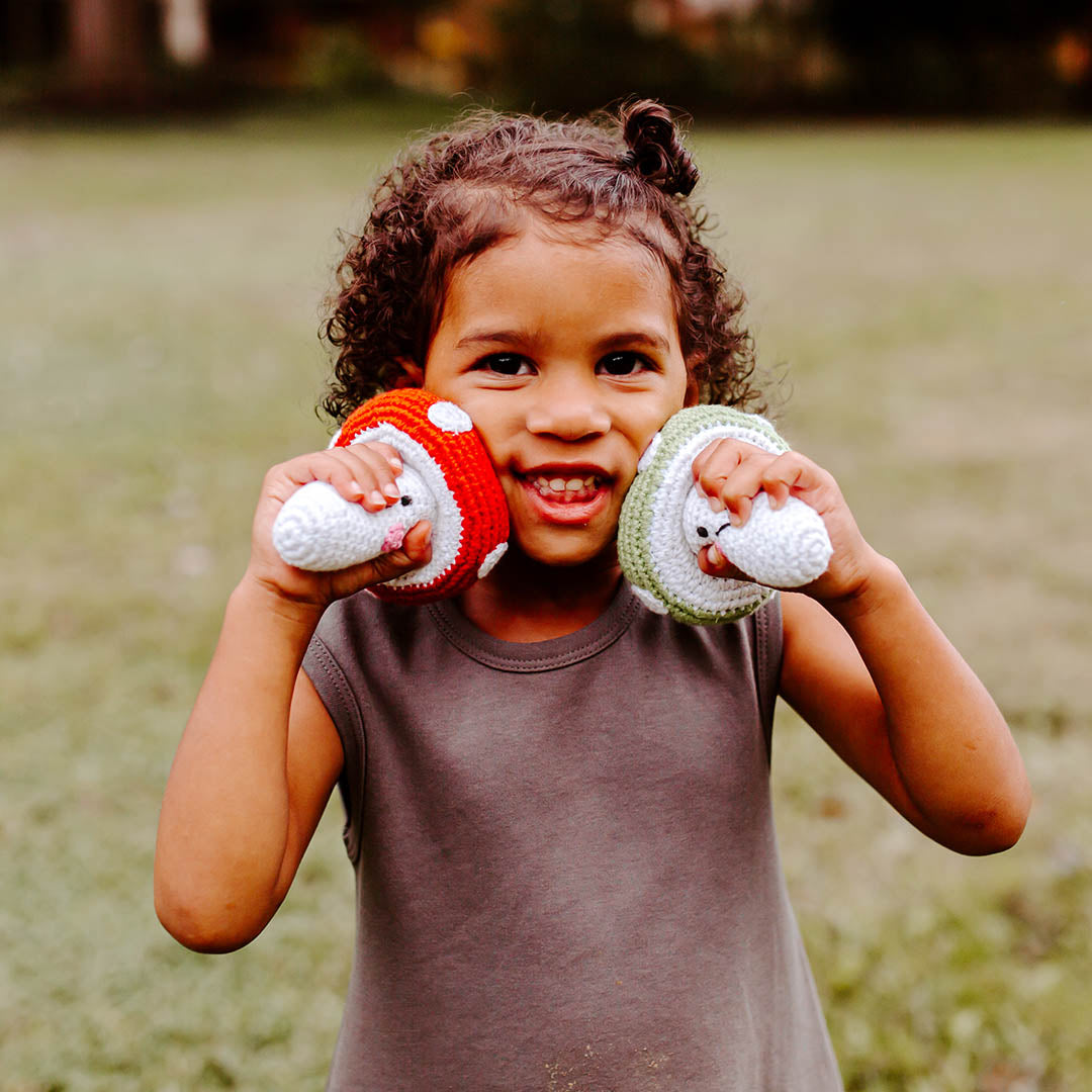 This happy little mushroom rattle is as adorable as it is enjoyable. Lovingly handmade with soft cotton yarn, it is easy to grasp for little hands and makes a soft rattle when shaken. Perfect for hours of pretend play, this crochet mushroom rattle toy is bound to be your child's favorite first vegetable.