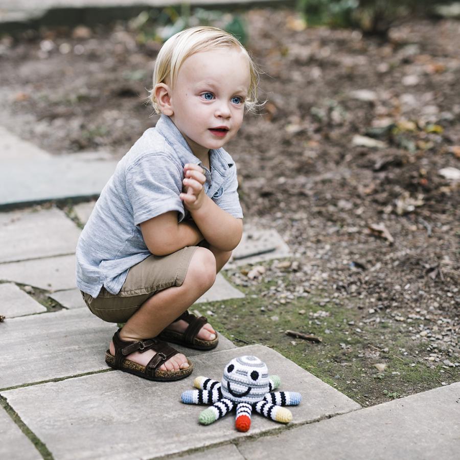 This happy little sea creature is a little hands' favorite! Our baby octopus rattle is colorful and full of personality. Handmade with lightweight cotton yarn, its soft rattle when shaken is sure to bring endless laughter and joy to your little one.