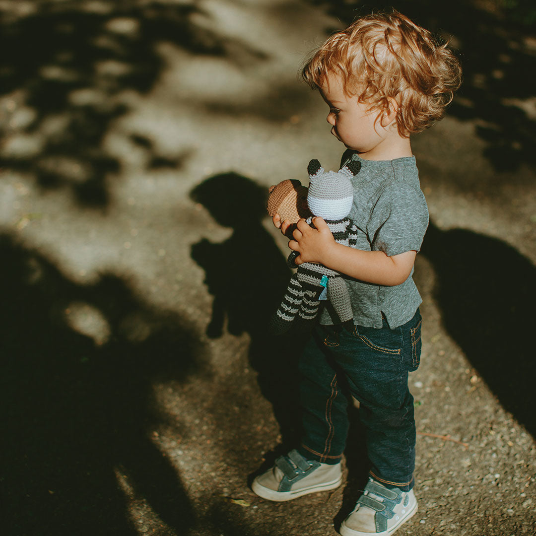 This quirky plush raccoon is looking for a way to sneak his way into your heart. Handmade with soft cotton yarn, this knit stuffed animal is perfect for hours of imaginative play. This Fair Trade baby toy pairs well with our other woodland toys, such as deer, fox, moose, and owl. Raccoon is perfect for cuddling, car trips, play dates and so much more.