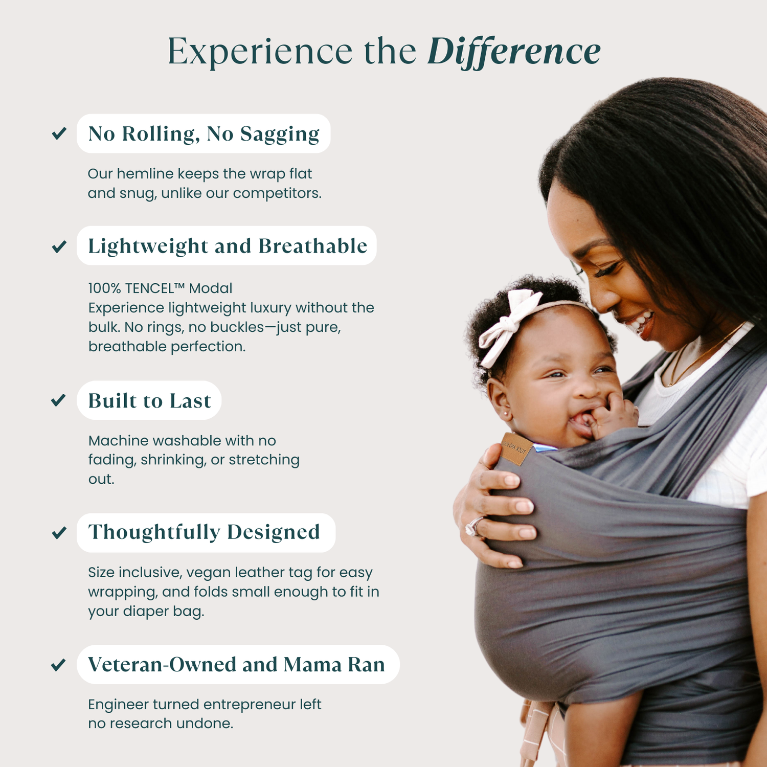 Slate Grey: A modern grey with the perfect sheen, soft as silk. A true neutral and our #2 Bestselling color. The only wrap you’ll ever need to calm even the fussiest of babies.