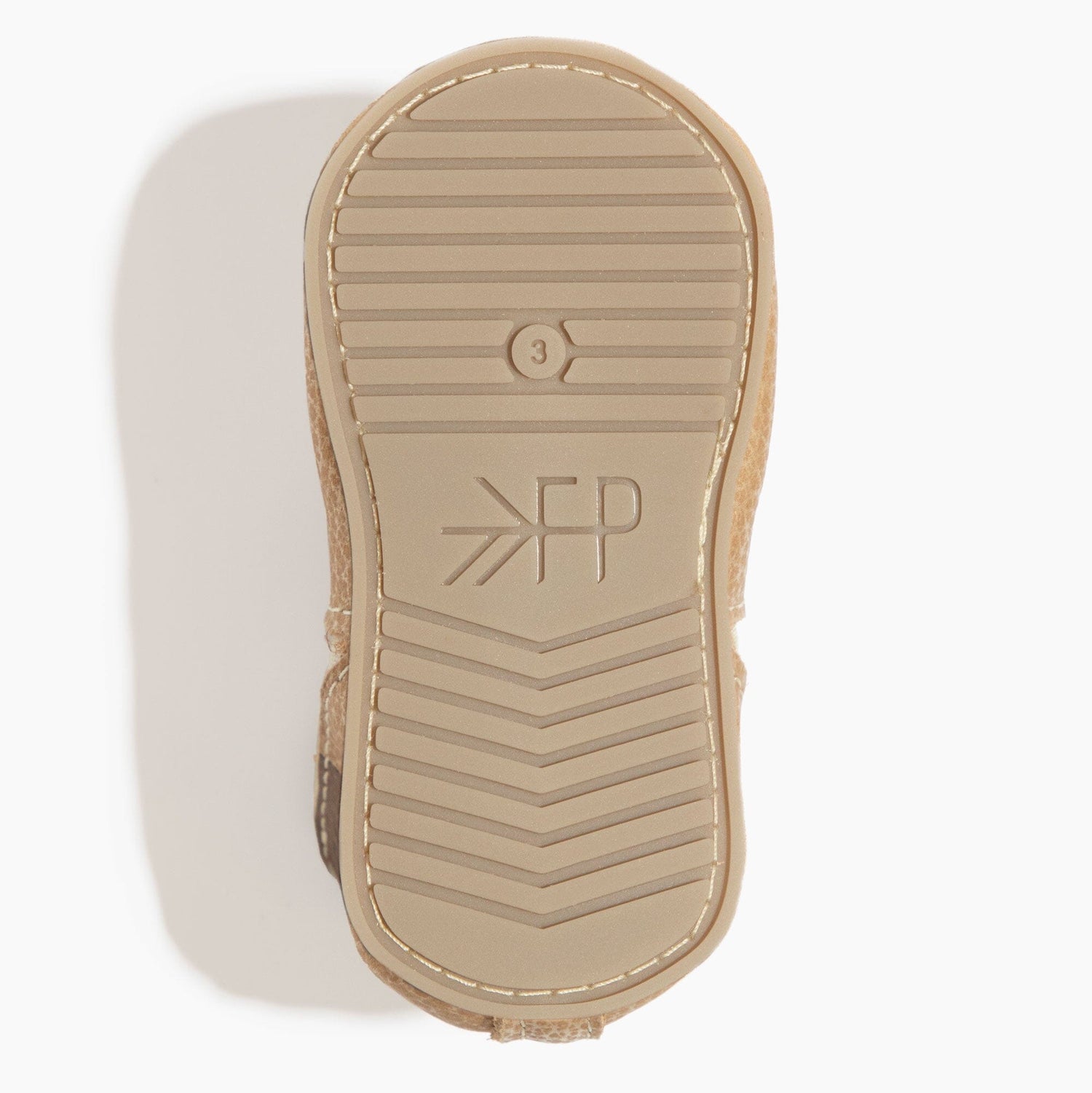 Freshly Picked was started by Susan Petersen sewing late nights at her kitchen table in 2009. She discovered a lack of cute baby shoes that wouldn’t fall off her little one’s feet. With that in mind, Freshly Picked was born. Her first pair of leather moccasins were created from yard sale scraps to fit her baby boy’s chubby feet.