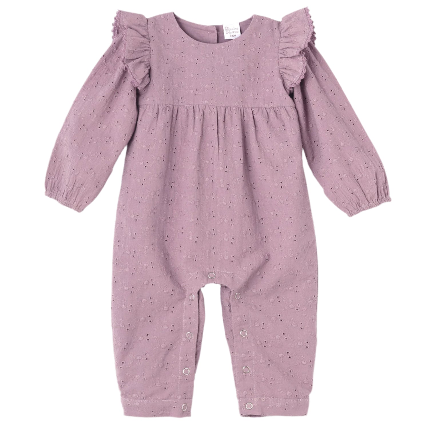 This soft lavender romper charms with an all-over eyelet pattern and sweet ruffle accents on the shoulders. Made from 100% cotton, it features long puffed sleeves with elastic cuffs for a comfy fit, along with back buttons and snaps underneath for easy changes. A perfect blend of vintage-inspired detail and everyday elegance.