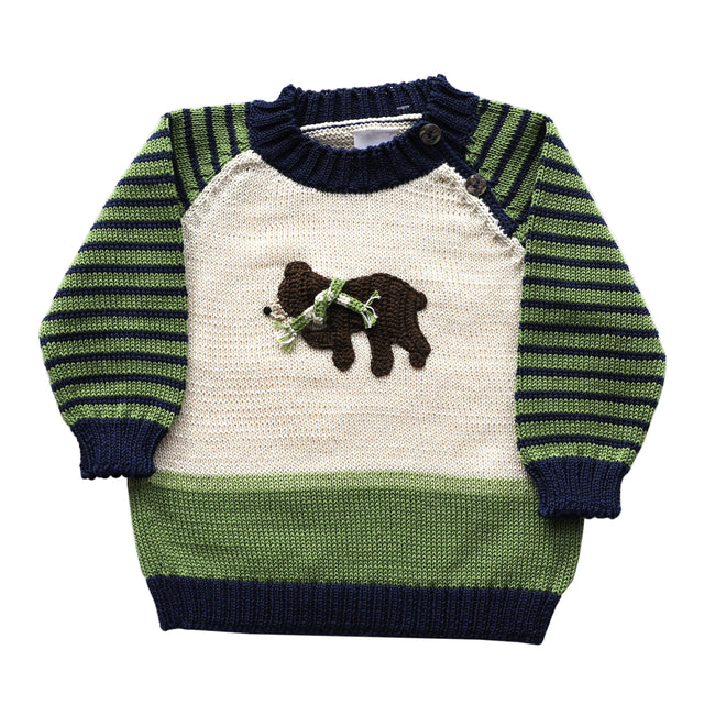 Adorable bear with scarf on ecru sweater with navy blue and green striped sleeves.