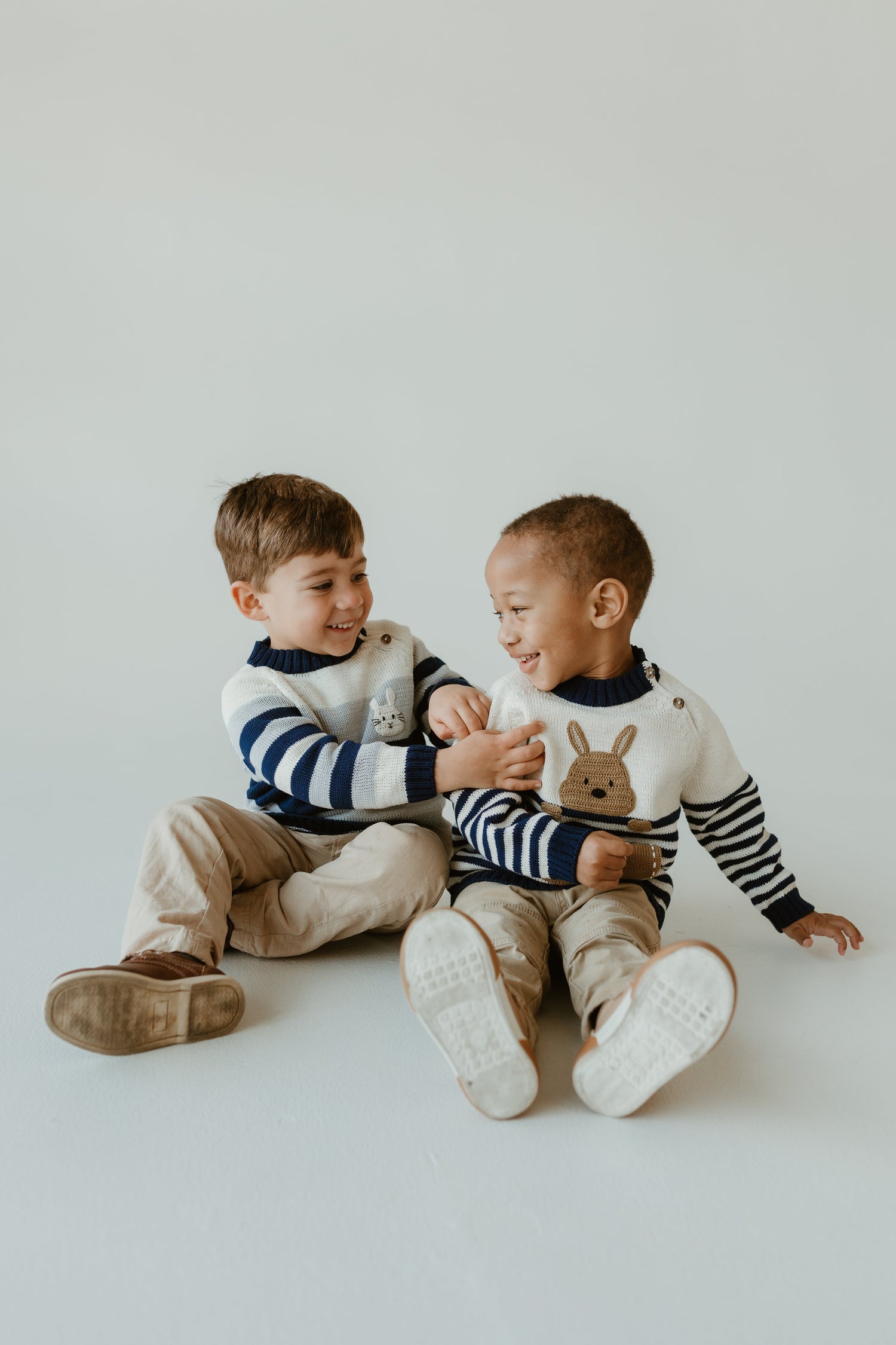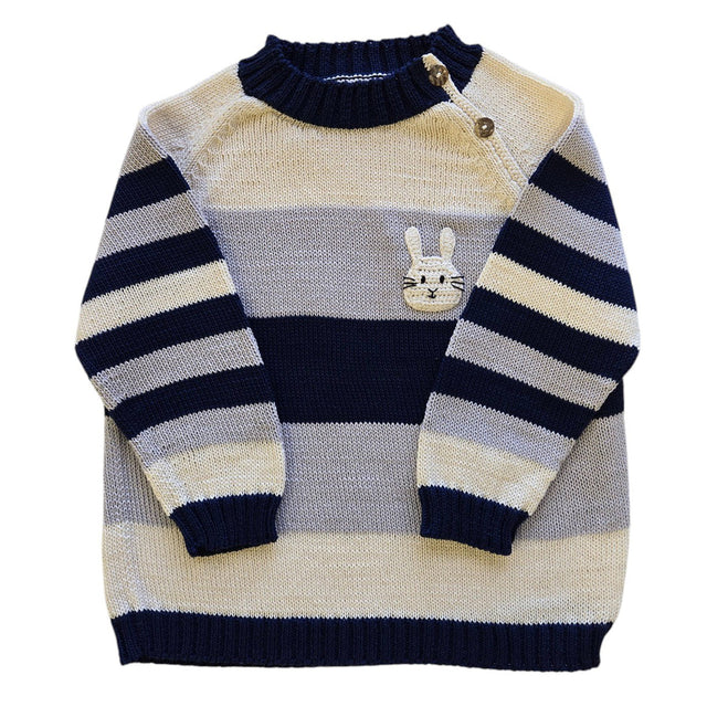 Wrap your little one in playful charm with this Bunny Striped Sweater, perfect for Easter and beyond! Featuring classic navy, light gray, and white stripes, this soft hand-knit sweater is both stylish and comfortable. A sweet embroidered bunny peeks out at the chest, adding a touch of whimsy to this timeless design. Thoughtful button details on the neckline make for easy on-and-off wear, ensuring both parents and kids love this piece.