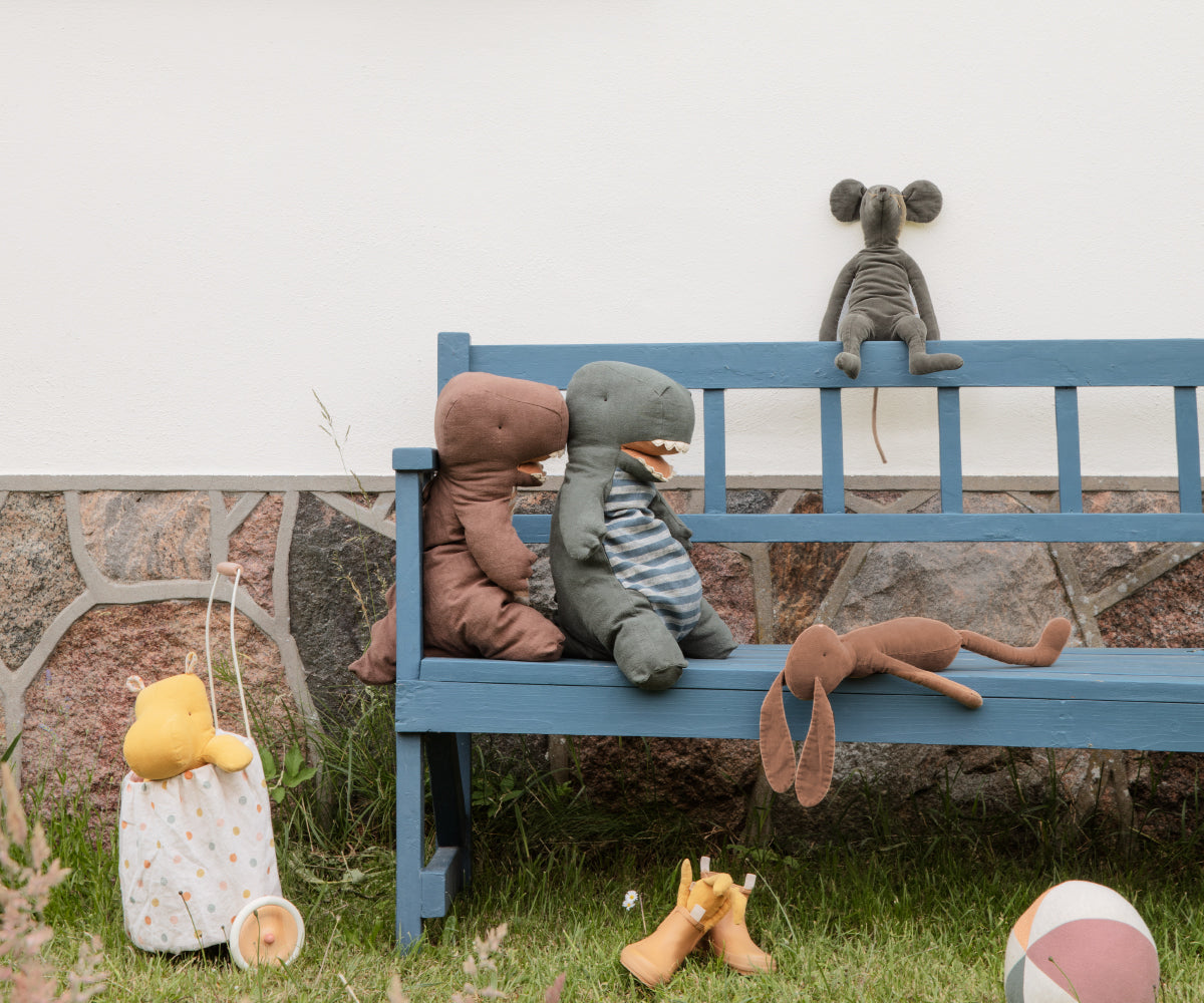 Look at this funny friend! A large Gantosaurus with big teeth has arrived and is ready to play with all of us. It is made in a soft mix of ramie and cotton, the striped stomach is made in a very nice blend of linen and cotton.