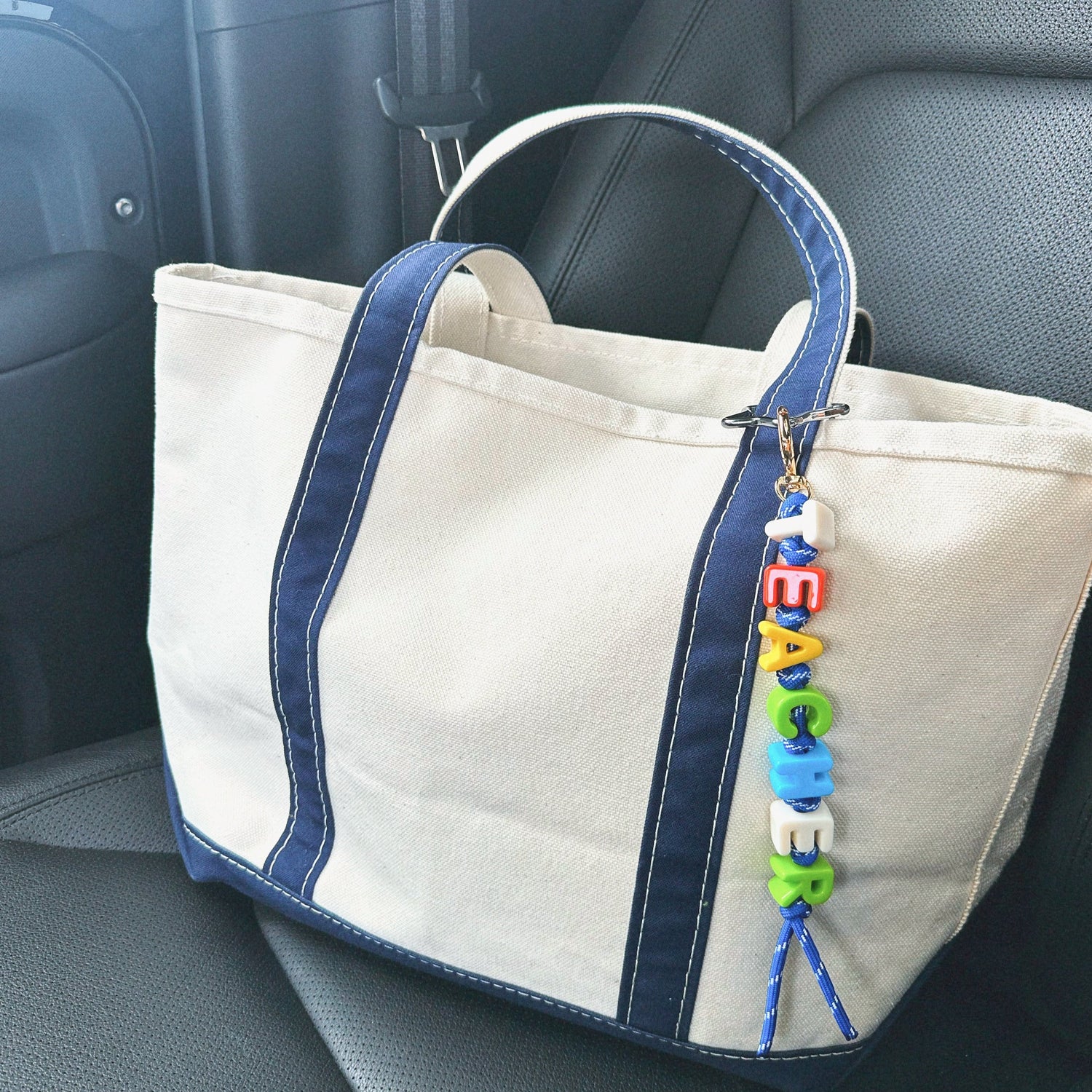 An adorable bag charm. Perfect for accessorizing your favorite handbag or keychain. Features a gold key loop, sturdy lace and resin beaded letters.