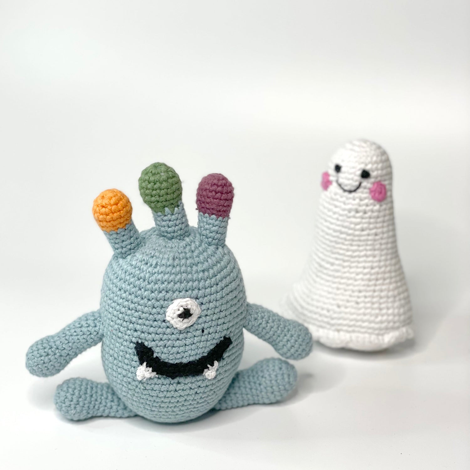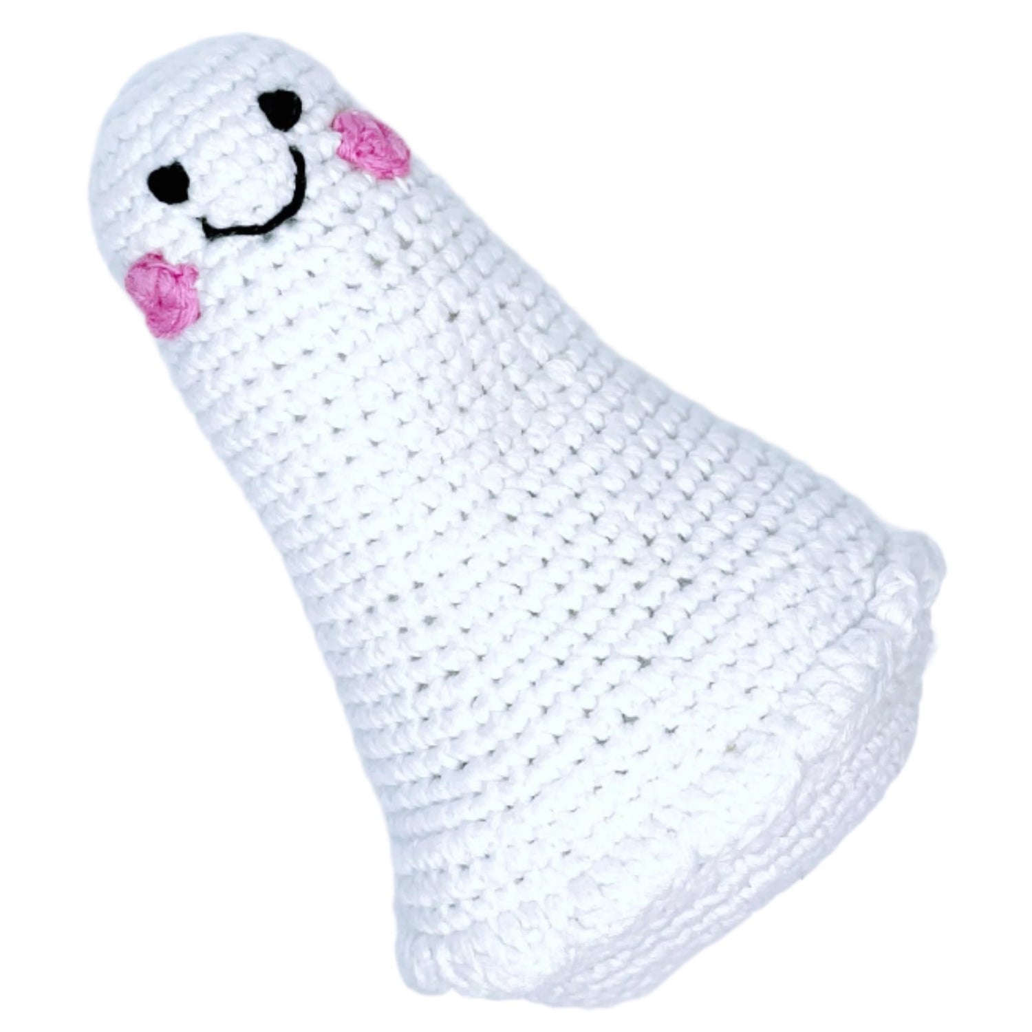 Nothing says "Boo" like our friendly little ghost rattle. Handmade with organic cotton yarn, these soft and squishy toys are perfect for baby's first Halloween. Pairs well with our other Halloween toys, such as Black Cat, Monsters and Spiders. The rattle inside this baby toy gives a small jingle when shaken.