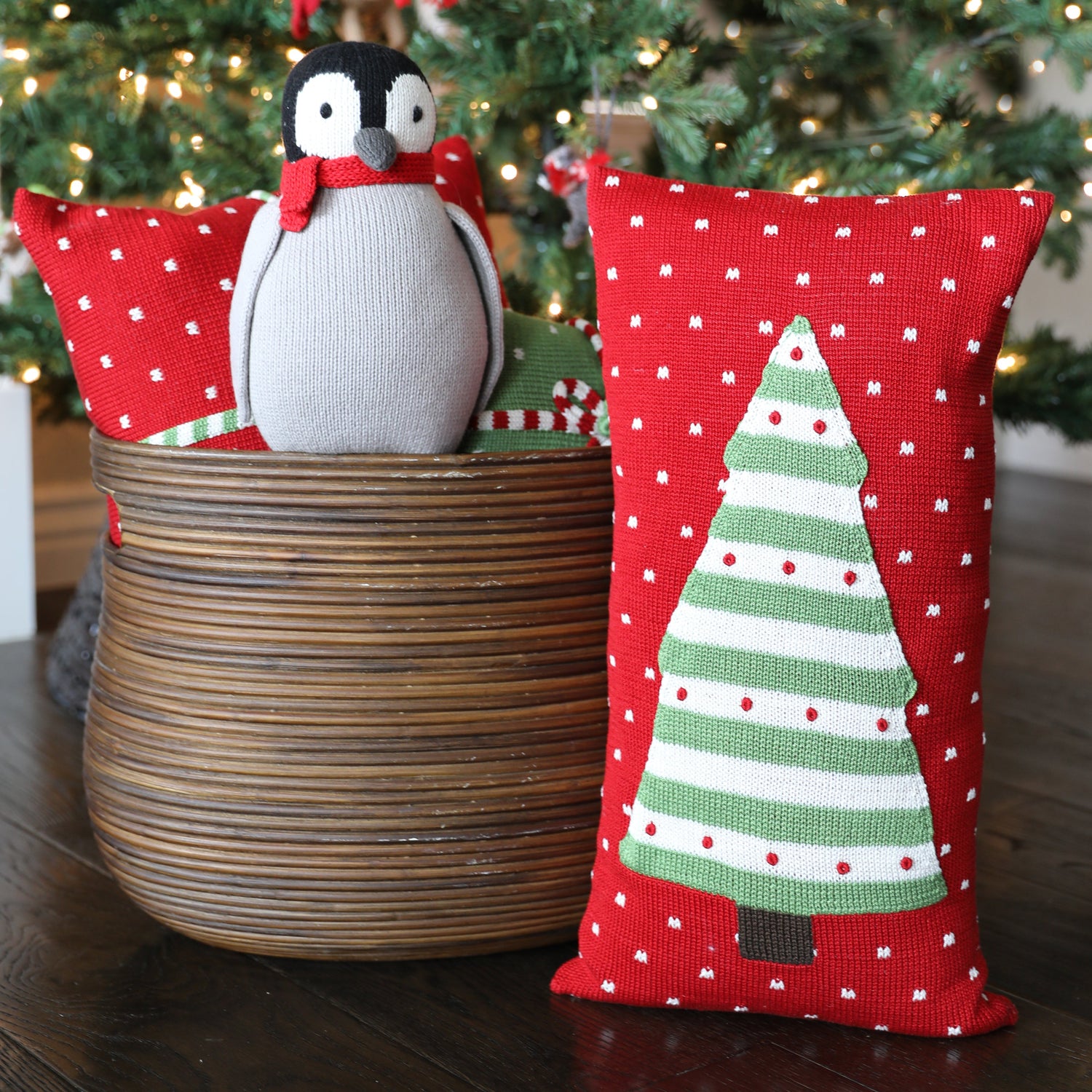 This knit holiday throw pillow brings a touch of festive cheer to your home with its charming Christmas tree design. The pillow features a beautifully striped tree, adorned with red accents, set against a rich red background sprinkled with delicate white dots, reminiscent of falling snow.