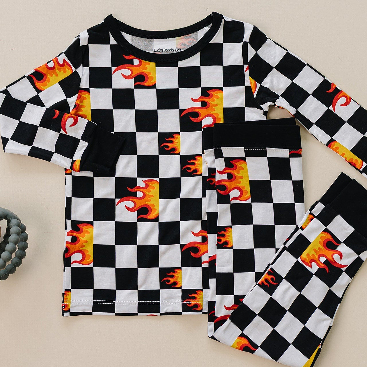 The Bamboo Two Piece Set | Checker Blaze brings the heat with its eye-catching black-and-white checks and blazing flame details. This bamboo toddler pajama set combines soft, stretchy bamboo comfort with a daring design that keeps your little one cozy and cool from morning to night. Perfect for playdates, bedtime, or lounging in style.