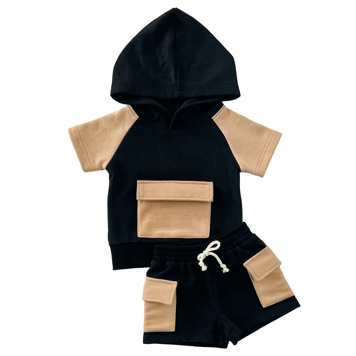 Terry Cargo Shorts Set | Black & Tan - 0-3M is backordered and will ship as soon as it is back in stock.