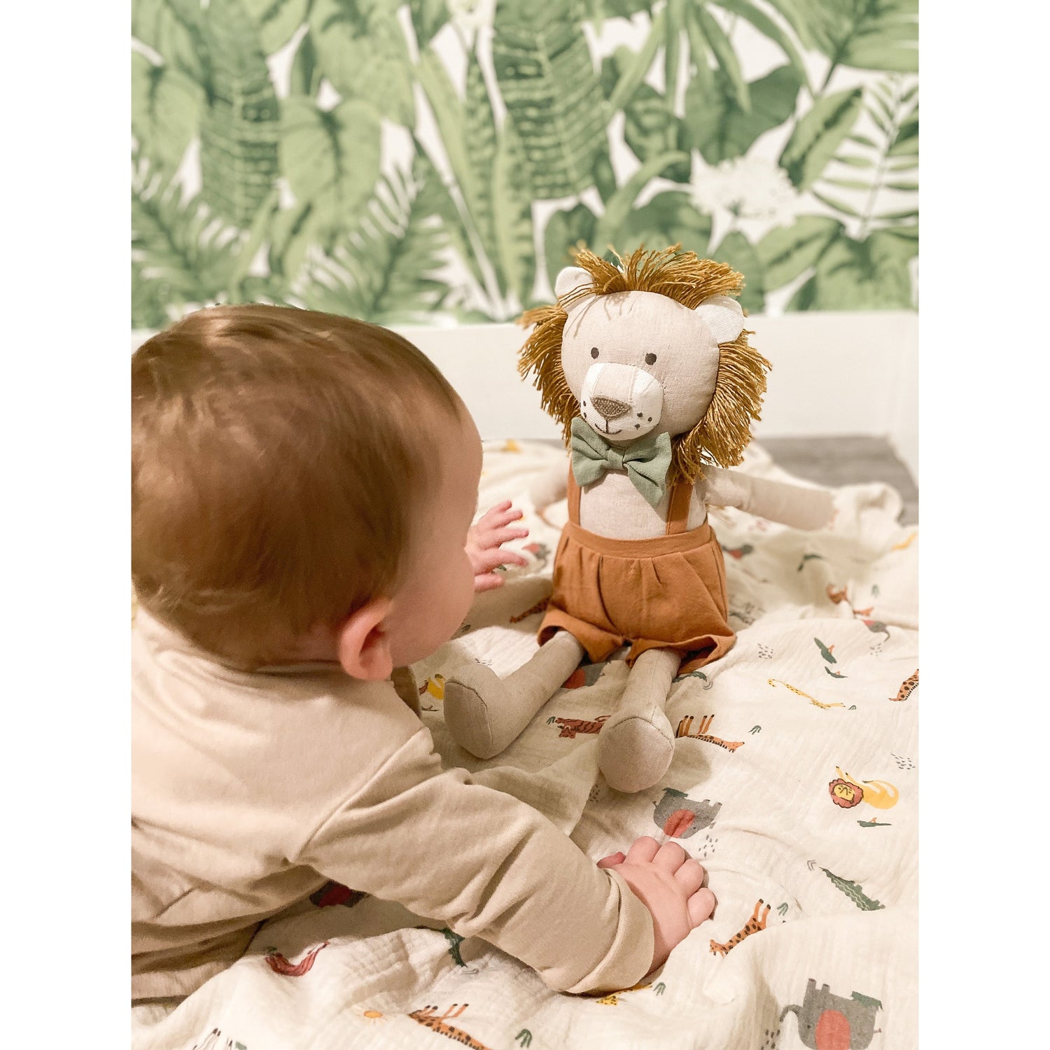 Meet Leopold Lion Doll, ready to roar with charm! Dressed in a dapper bow tie and overalls, Leopold boasts a delightful, embroidered face and a tassel-filled mane that adds extra fun. His soft, huggable design makes him perfect for playtime and snuggling, making him an ideal gift for any occasion.