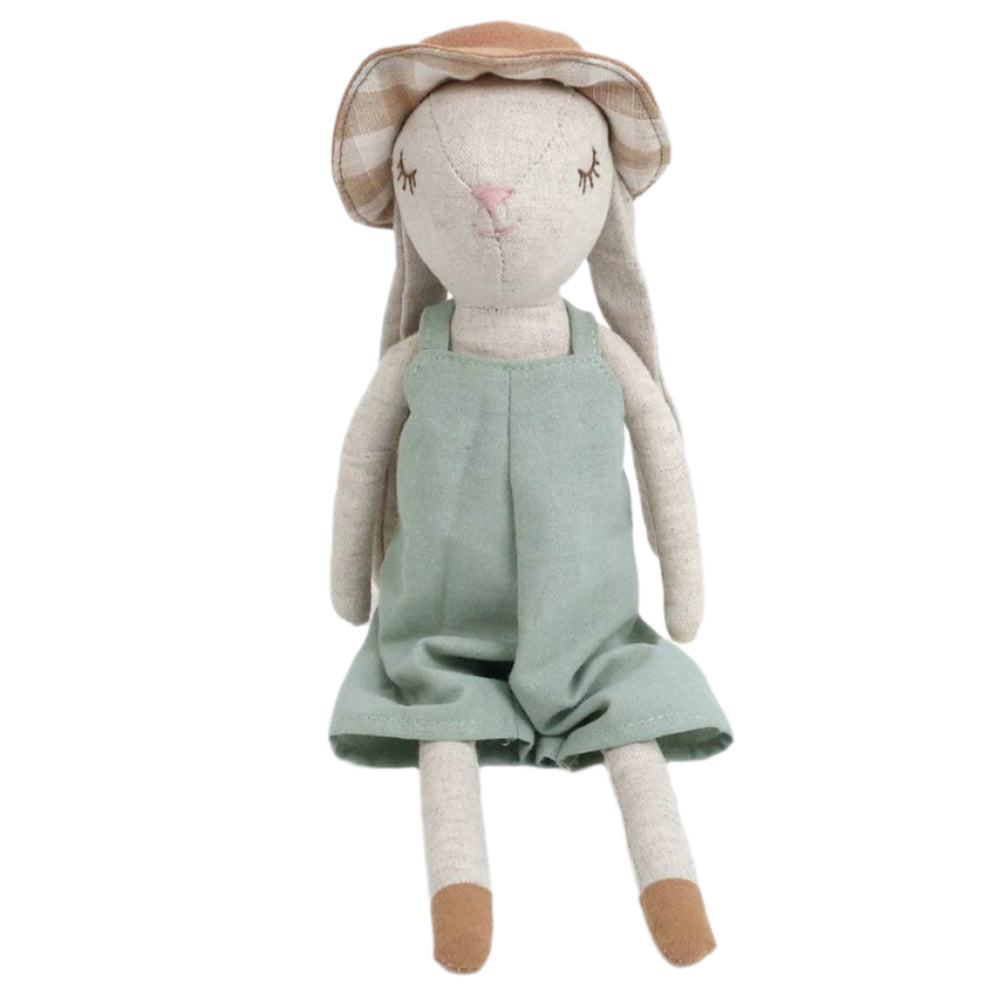 Hop into Easter with Mon Ami's delightful Mr. Hopper Bunny! This charming, one-of-a-kind bunny is here to bring extra joy to the season! Lovingly crafted from soft linen -like material that’s gentle on little ones' sensitive skin, Mr. Hopper Bunny sports a whimsical sage colored overall and a gingham sun hat, perfect for sunny spring adventures. With its sweetly embroidered face, long floppy ears, and irresistibly cuddly body, Mr. Hopper Bunny is sure to hop straight into your heart. Make your Easter baskets extra special with this enchanting, snuggle-ready companion!