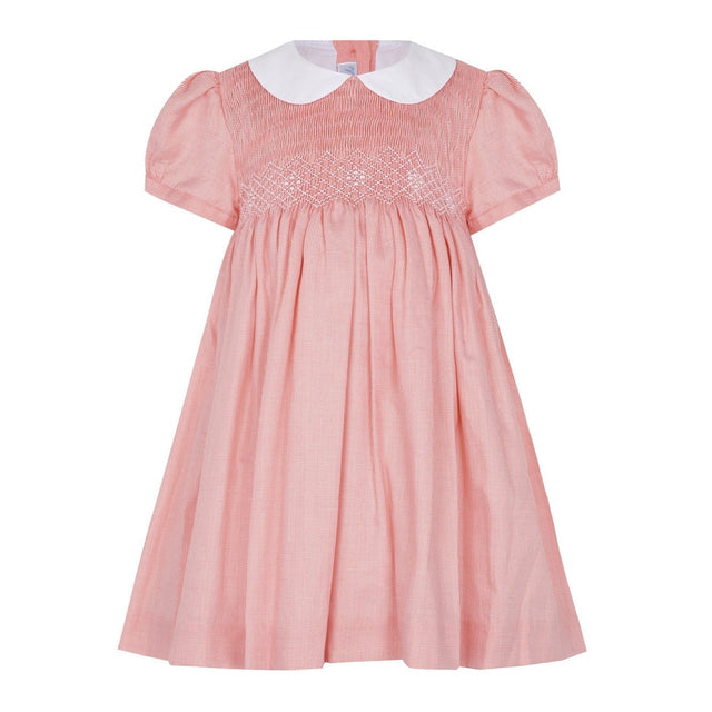 Our Coral Woven Dress, a timeless staple for every little girl's wardrobe! Crafted with love and attention to detail, this dress features exquisite handmade smocked detail on the front, complemented by a charming white round collar that adds a touch of elegance and charm. The beautiful bow on the back completes the look, making it perfect for any special occasion.