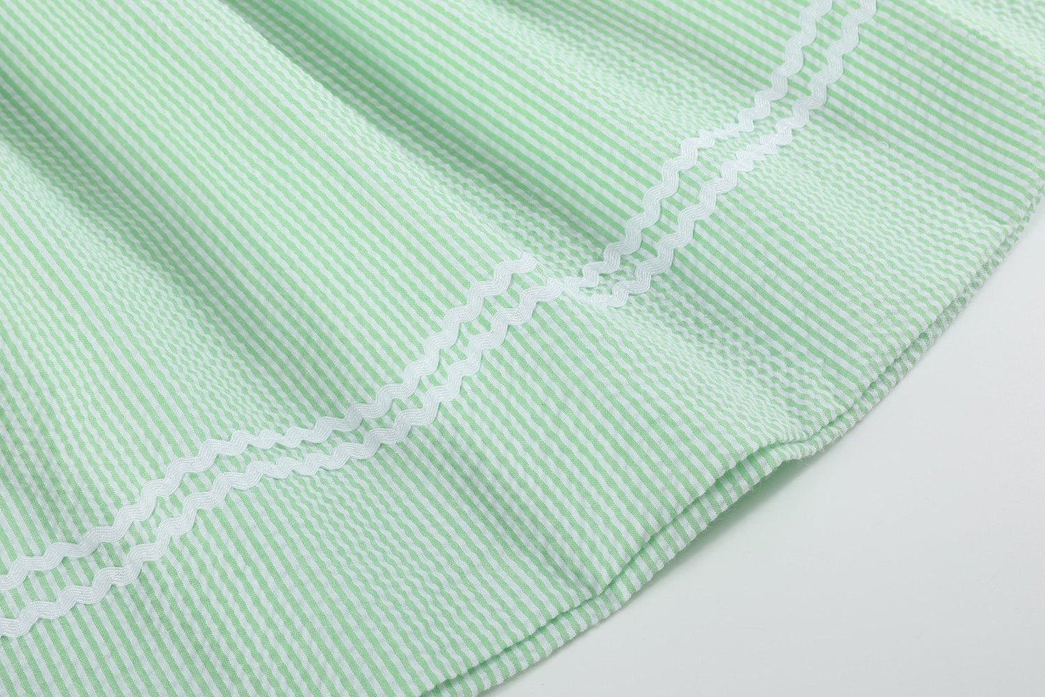 The Green Seersucker Easter Bunny Smocked Bishop Dress is perfect for your little girl's Easter celebration! Made from a pretty green seersucker cotton, it features a smocked neckline with adorable embroidered bunnies topped with fluffy pompom tails. Sweet rickrack trim adds a playful touch. This charming dress is ideal for Easter egg hunts, family gatherings, and all her springtime adventures!