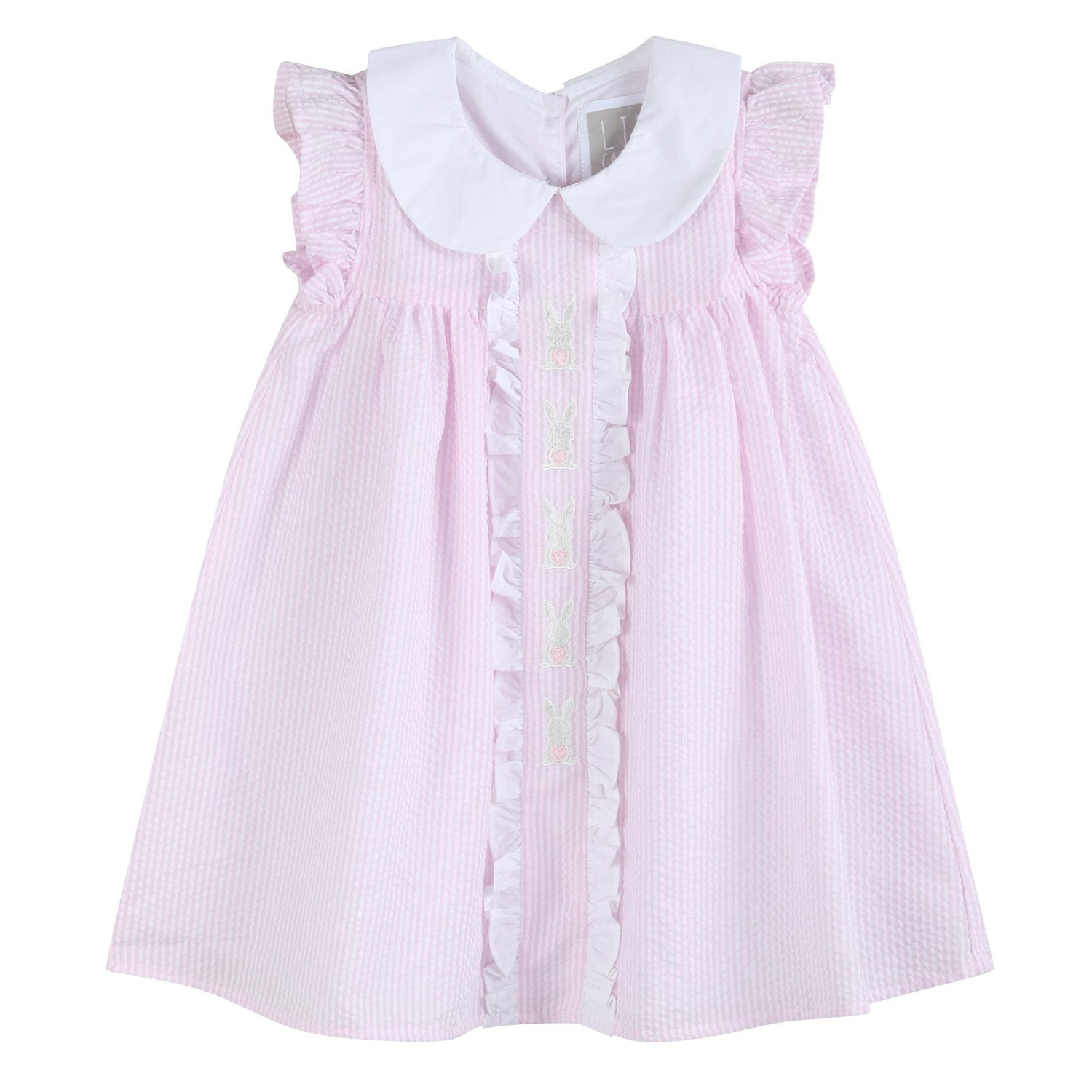 Get your little bunny ready for Easter in this adorable Pink Seersucker Easter Bunny Ruffle Dress! Featuring a crisp white collar and playful white ruffle trim, this dress is perfect for Easter Sunday and the entire spring season. The charming embroidered bunnies, complete with heart-shaped tails, add a delightful touch that will have her hopping with joy all day long!