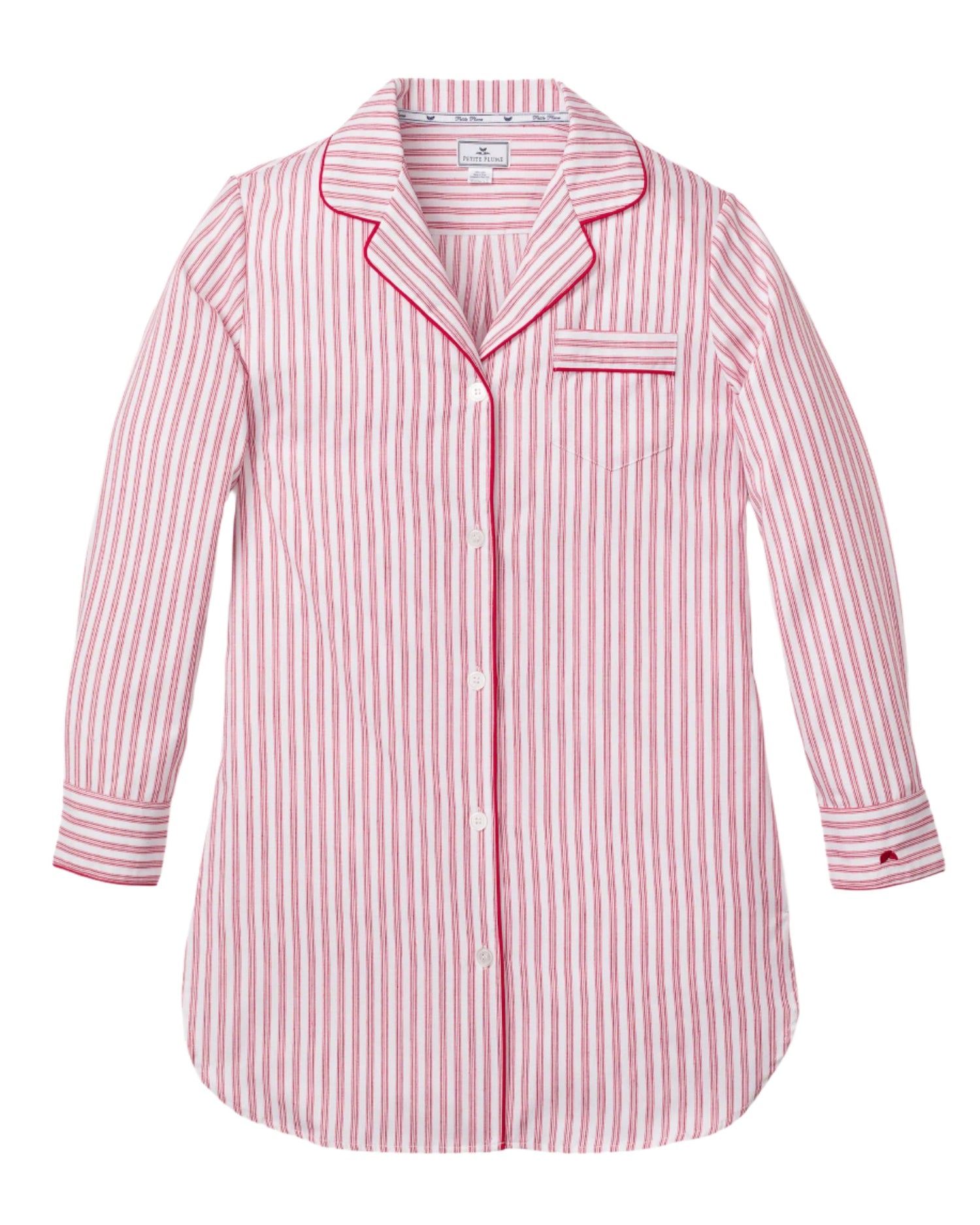 A new take on a classic pattern, with no frills just clean, crisp lines. This gorgeous Antique Red Ticking nightshirt is a perfect fit! This exquisite nightshirt is trimmed with red piping and finished with pearl buttons.