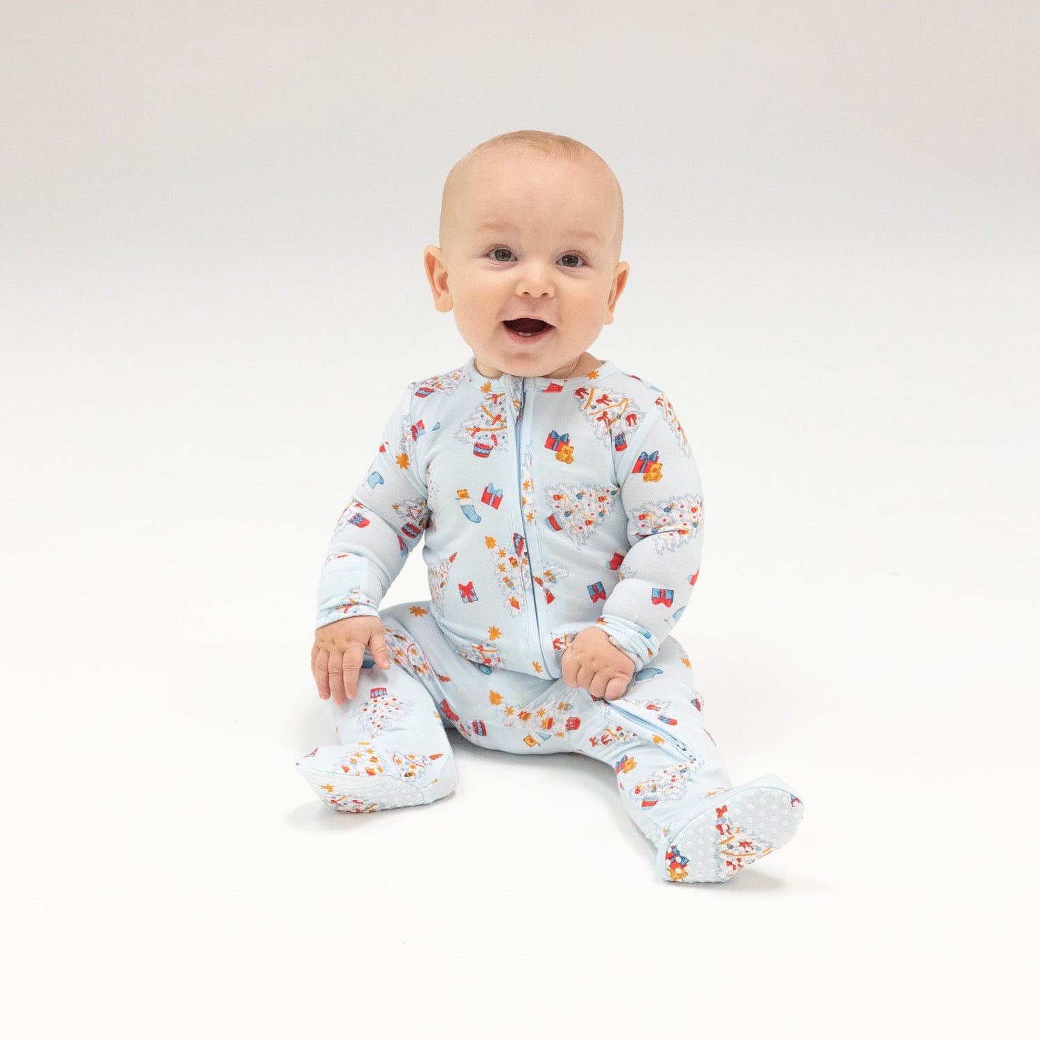 2 Way Zipper Footie - Vintage Christmas Trees Blue