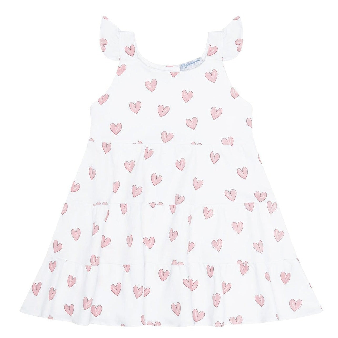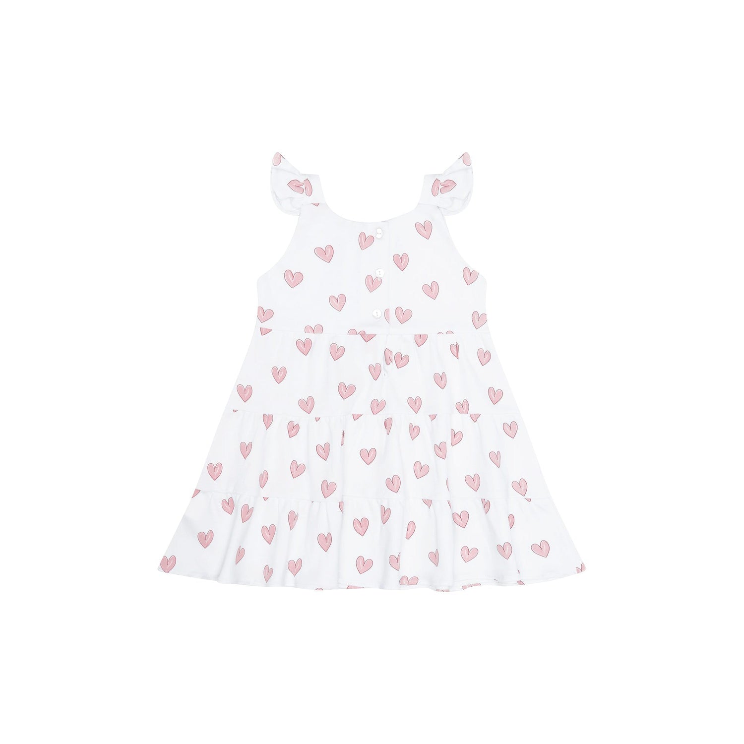 With its adorable pink hearts and delightful ruffles, this dress is sure to become her new favorite outfit. The ruffles adorning the dress add a touch of enchantment and elegance.