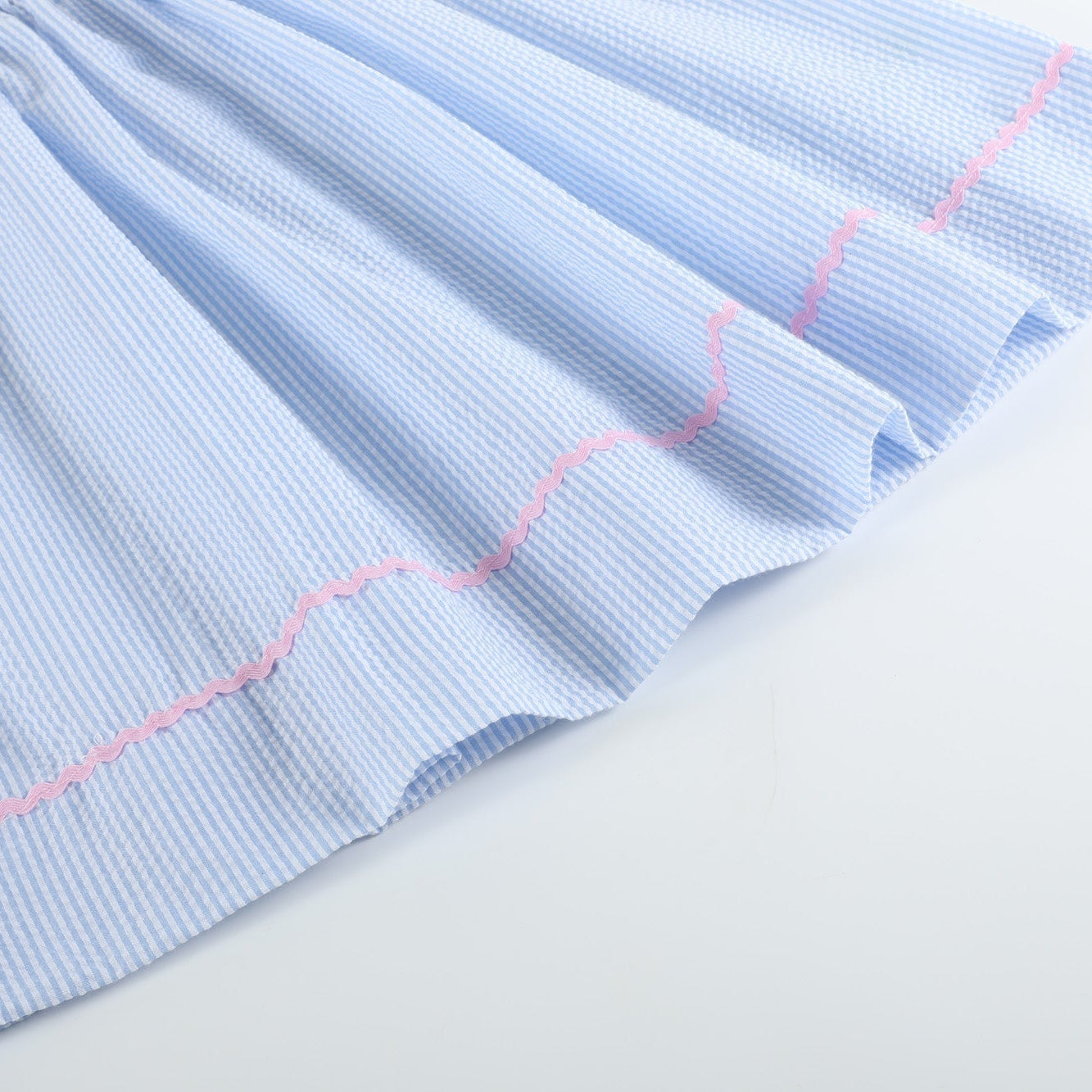Transform her wardrobe with this beautiful Blue Seersucker Bow Smocked Bishop Dress. Classic smocking and embroidered bows make this dress a timeless favorite. Its lightweight seersucker fabric will keep her cool while she looks perfectly polished!