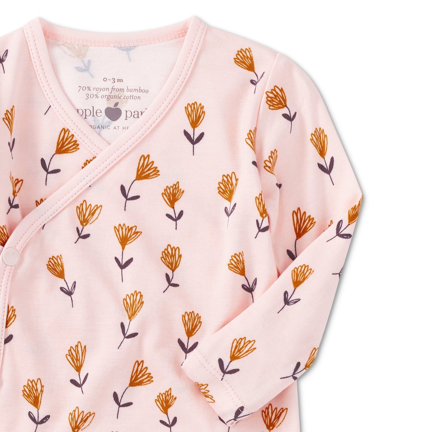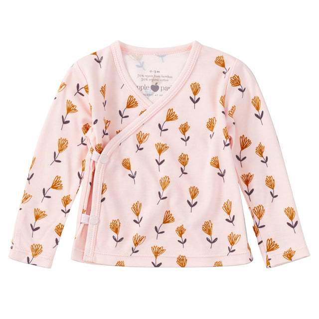 • Long-sleeve kimono style with inner tie and hidden snaps for easy dressing
