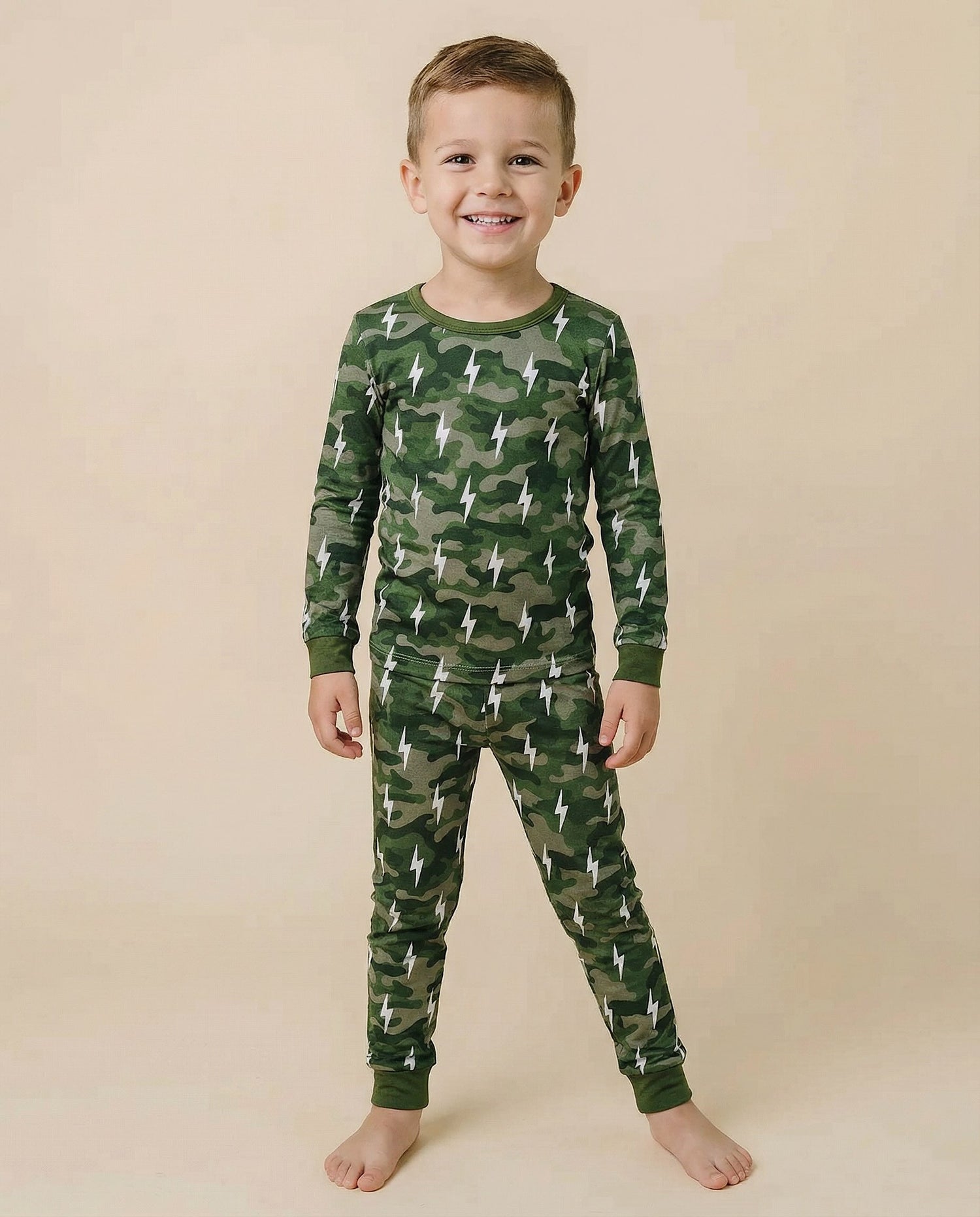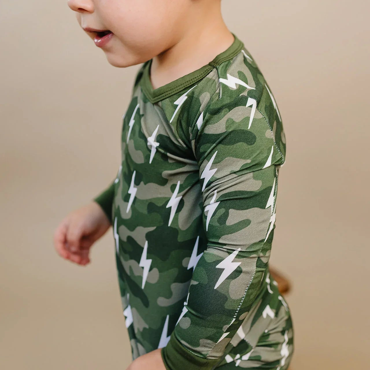 The Bamboo Two Piece Set | Green Camo Bolts delivers adventure-ready comfort with a modern twist. Featuring classic green camo and bright white lightning bolts, this bamboo toddler pajama set blends fun design with everyday softness. Made from premium bamboo fabric, it’s perfect for play, rest, and everything in between.