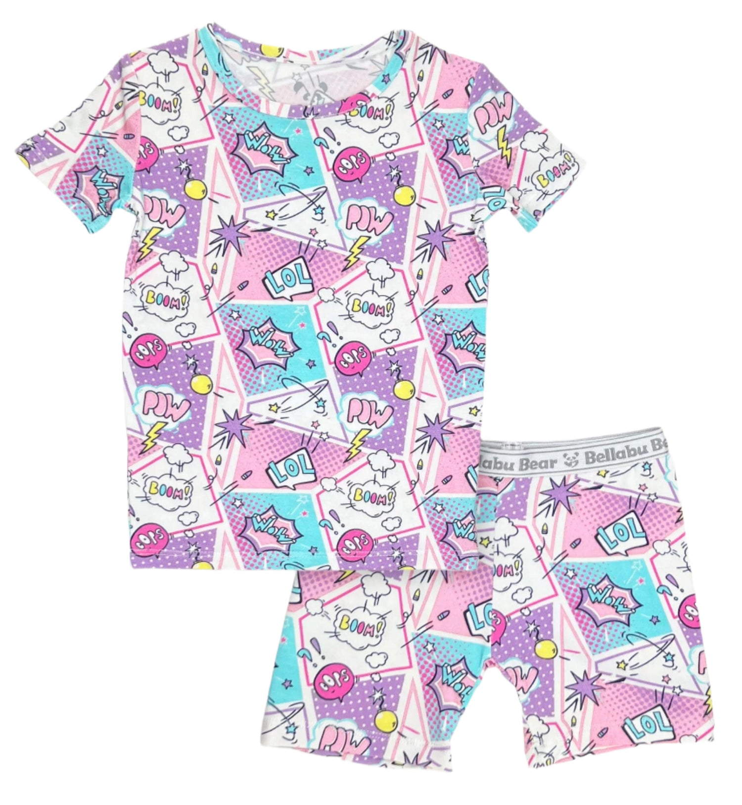 Get ready for a night of superhero dreams with our Comic Purple Bamboo Kids Pajama Short Set! Made from ultra-soft bamboo fabric, these pajamas offer the perfect blend of comfort and style. Featuring vibrant comic book-inspired designs, your little one will feel like a true hero as they drift off to sleep. With a snug fit and breathable material, these pajamas are ideal for a cozy night's rest. Elevate their bedtime routine with our Comic Purple Bamboo Kids Pajama Short Set today!