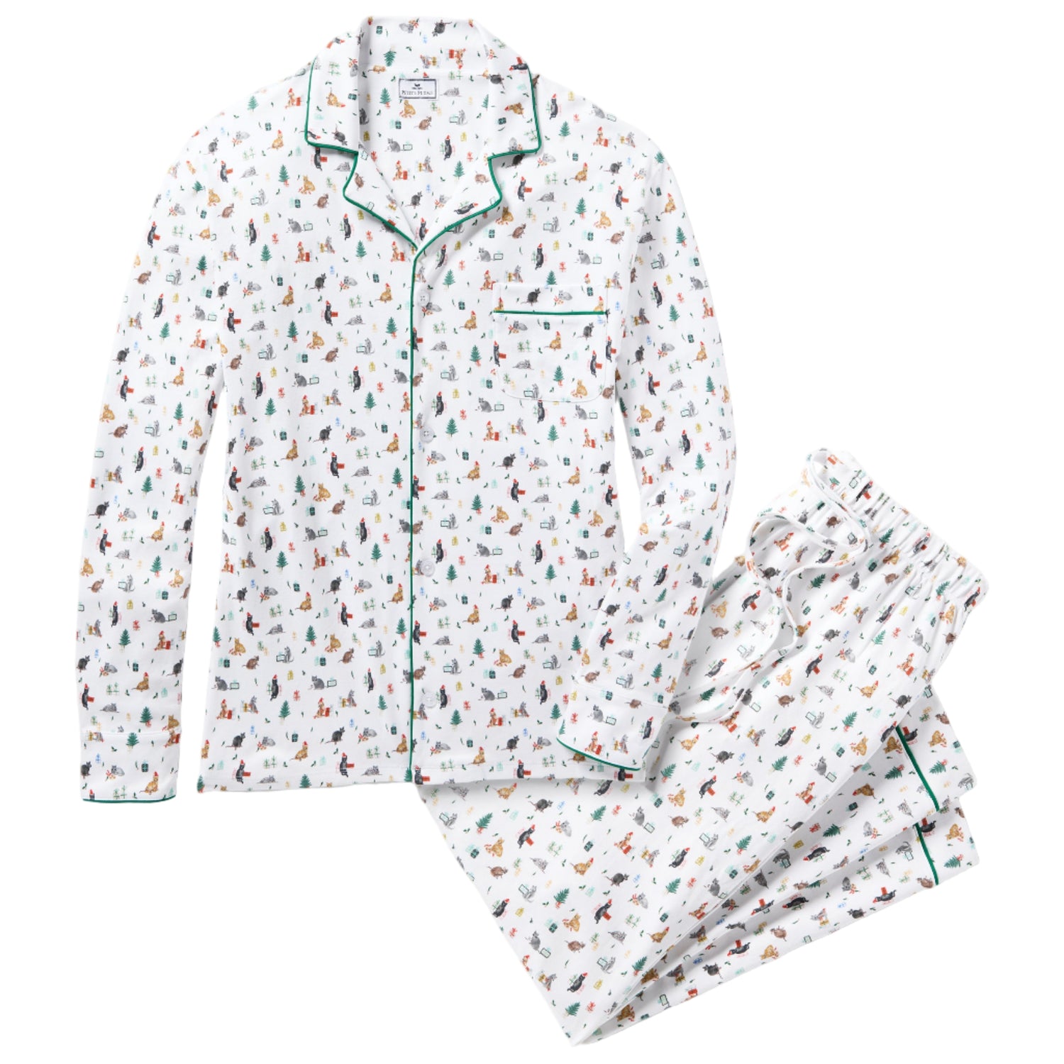 This whimsical holiday print is decked out with festive felines. Honor the family pets this season, and maybe the extra attention will keep them away from the tree. The quintessential, timeless pajama silhouette that always feels fresh: supple elastic waist, single piping detail at collar, breast pocket, and pajama pant cuff and practical pockets. As effortless and comfortable as luxury sleepwear gets.