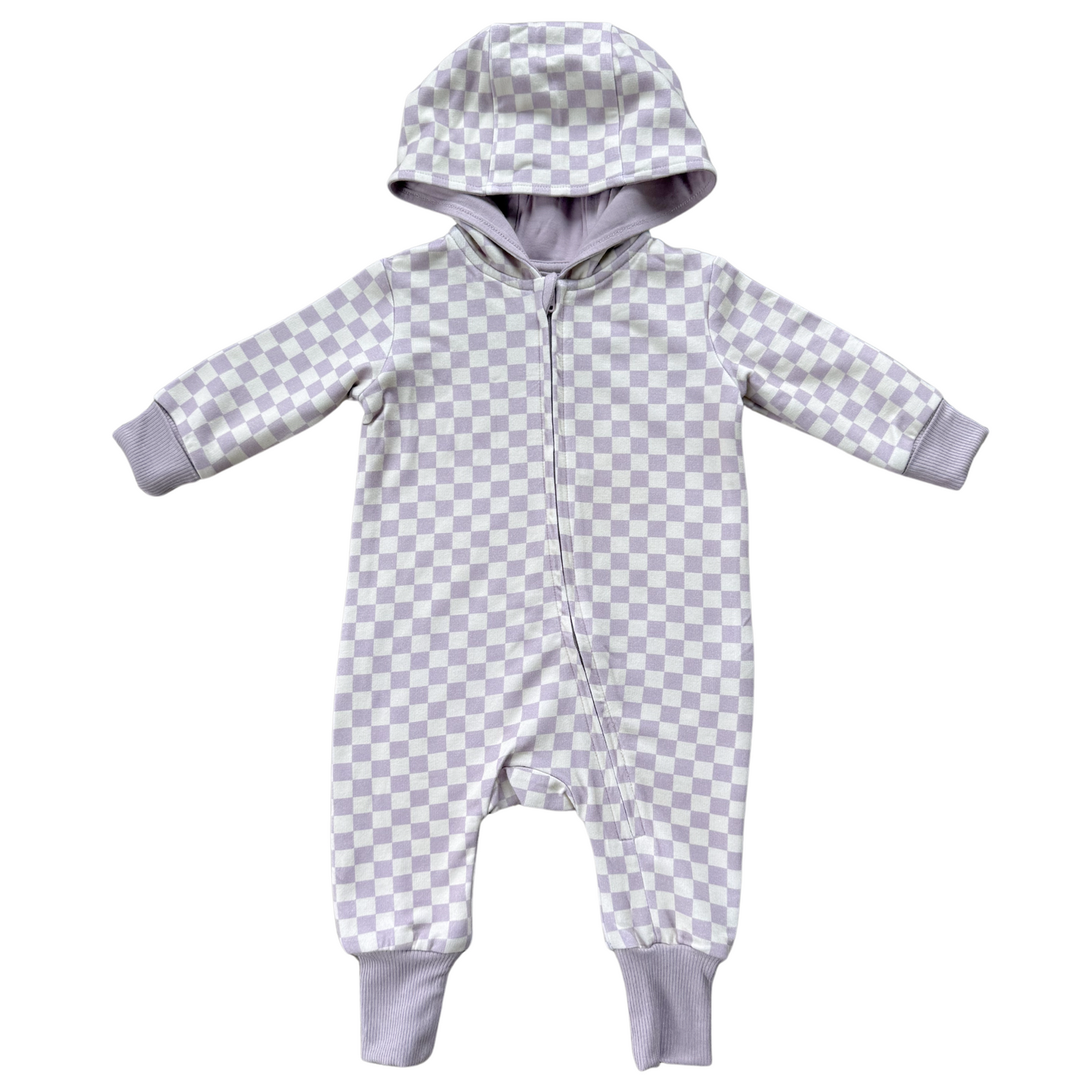 Terry Zip Romper - Lavender Cloud Checkered / NB is backordered and will ship as soon as it is back in stock.