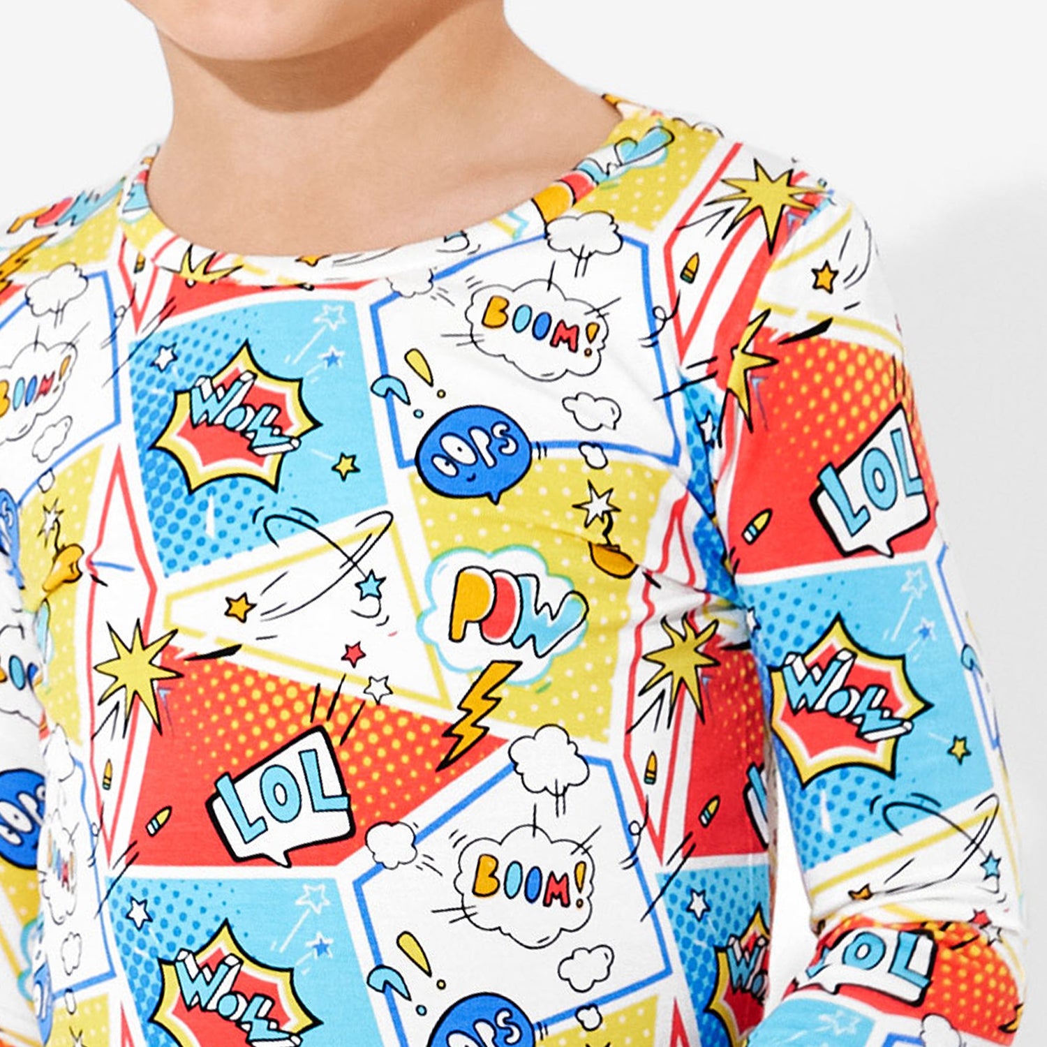 Unleash your little hero's bedtime adventures with our Comic Hero Bamboo Kids Pajamas! Made from super-soft bamboo fabric, these pajamas are as comfortable as they are stylish. Featuring a vibrant comic book-inspired print, your child will feel like they're ready to save the day every night. The breathable and hypoallergenic material ensures a restful sleep, while the durable construction means these pajamas can withstand any nighttime mission. Upgrade your child's sleepwear game with our Comic Hero Bamboo Kids Pajamas and let their imagination soar! Available in a range of sizes, these pajamas are perfect for every young superhero in training.