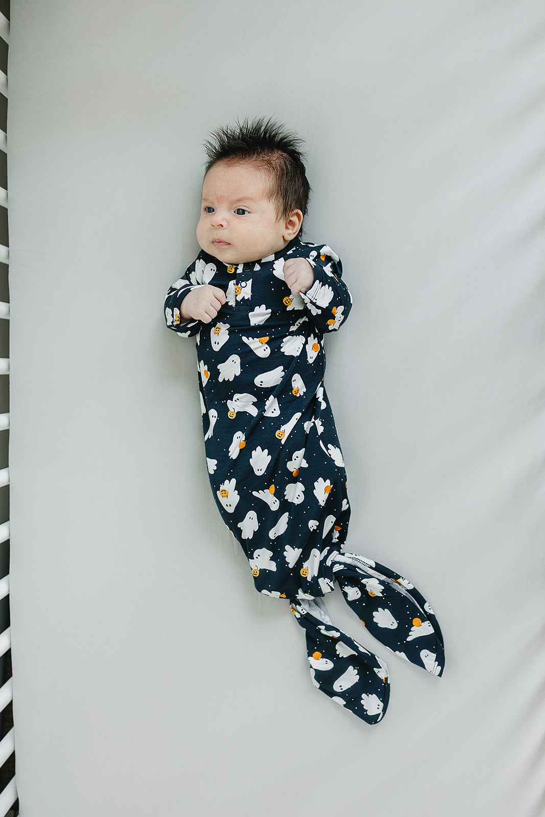 These gowns are size 0-3. We love these Halloween Themed Gowns. They are made out of supremely soft Bamboo Rayon to keep your little one comfortable. We have a variety of gender neutral designs and colors making them perfect for any baby. They have fold over hands and two snaps for easy on and off. We also have shoulder flaps to make it easily pull over your little ones head, we want to make dressing your baby as easy as possible. The bottom is easily tied and untied in a knot for no-fuss diaper changes which makes it a newborn baby essential! These are made out of the same fabric as our stretch swaddles and match the colors of the stretch swaddles, head wraps, and hats.