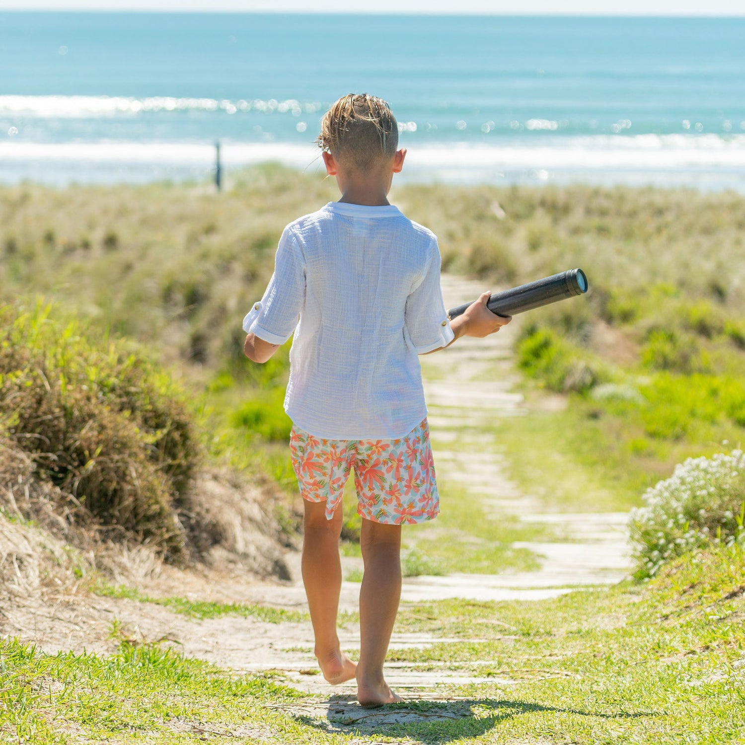 Tougher than a honu and cooler than a shaved ice, our boys' swim shorts are made of sustainable, UPF50+ fabric that sports a fresh floral print, stripey drawcord, mesh lining, and pockets.