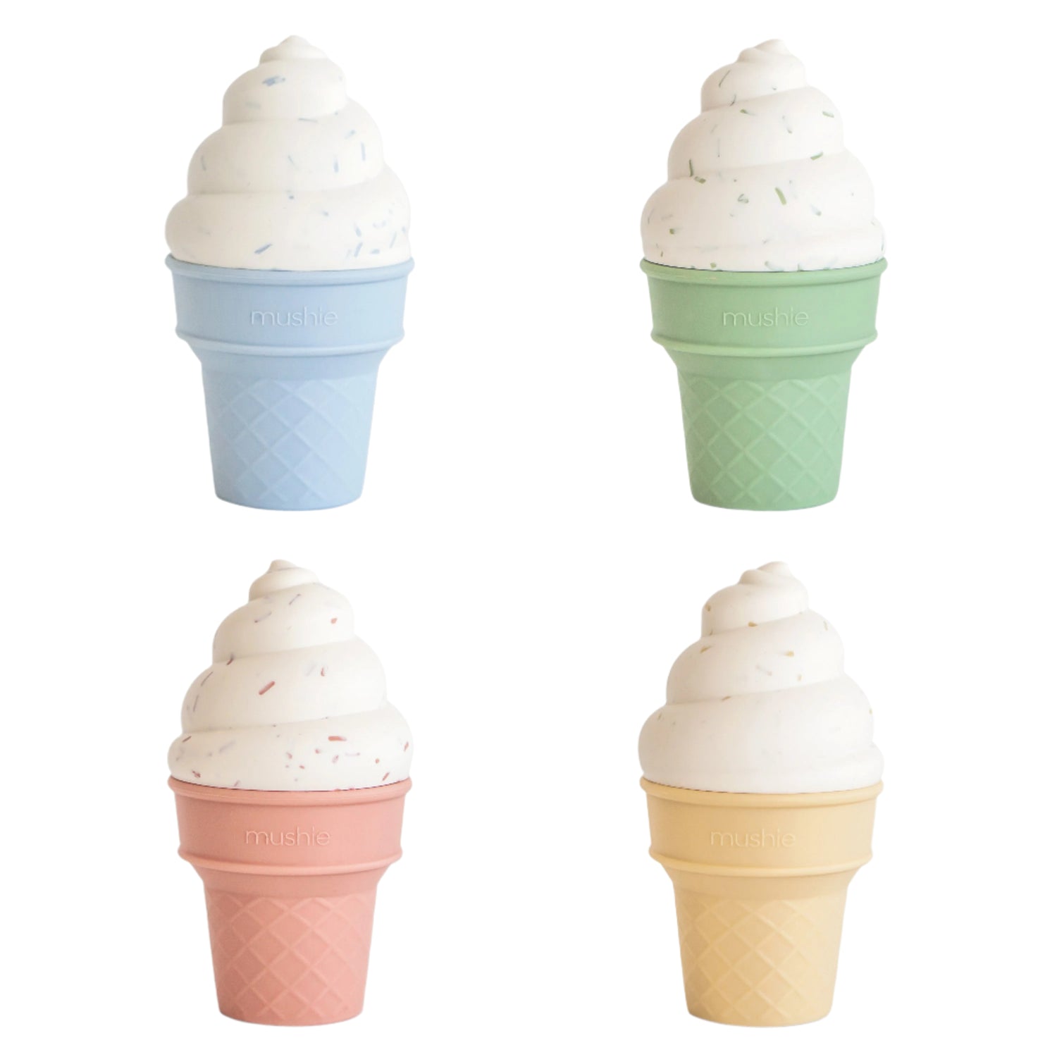 The Mushie mix and match ice cream toy set will add a scoop of fun to playtime. Made in four delicious shades, littles can practice color matching or get creative and serve up their own combinations. The squeezable silicone ice cream tops and cones easily separate and reattach to help develop fine motor skills and hand-eye coordination. Made of non-toxic, easy-to-clean silicone, these are a perfect addition to play kitchens, bath time, or beach days.