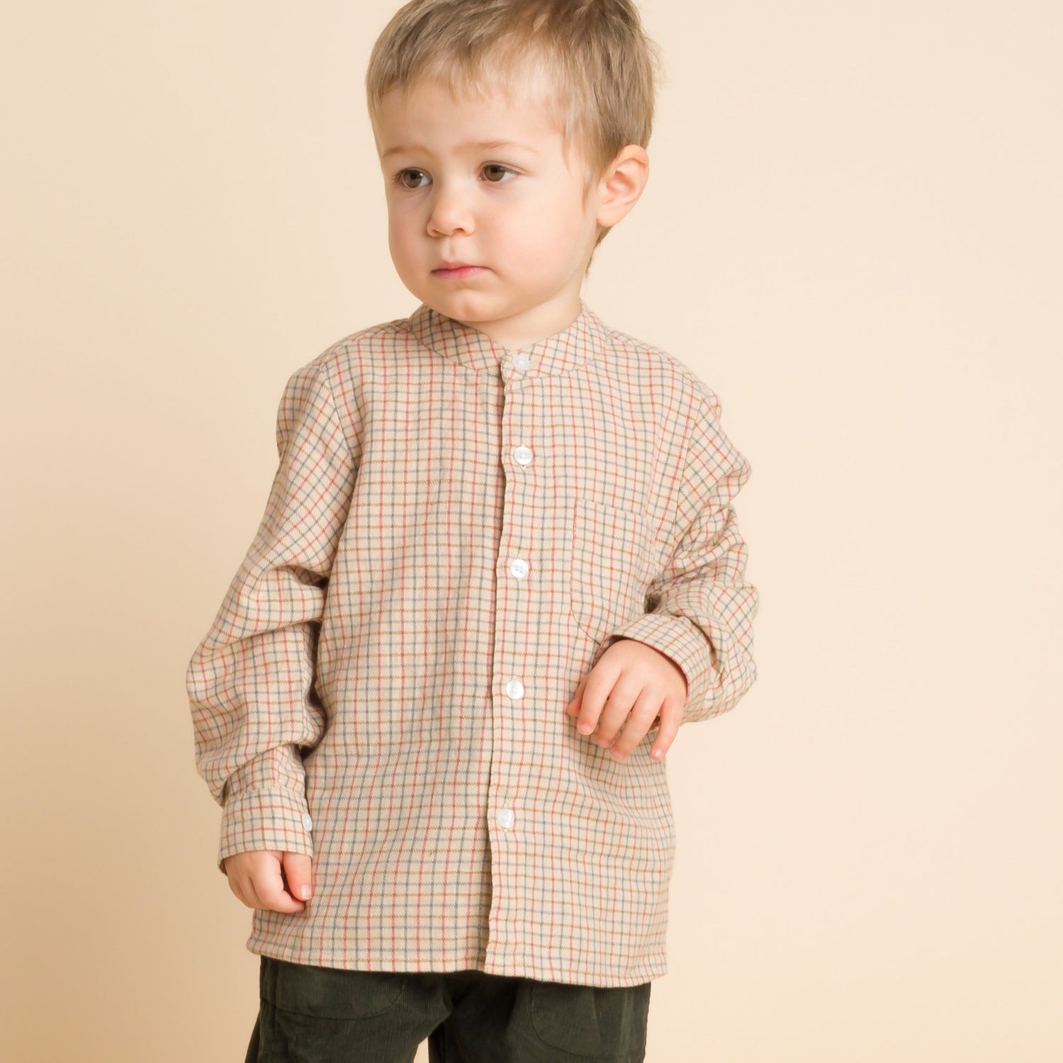 Smart, relaxed and comfortable shirt featuring a band collar around the neck line and long sleeves. The light beige check is both warm and cozy – just the way kids like it!