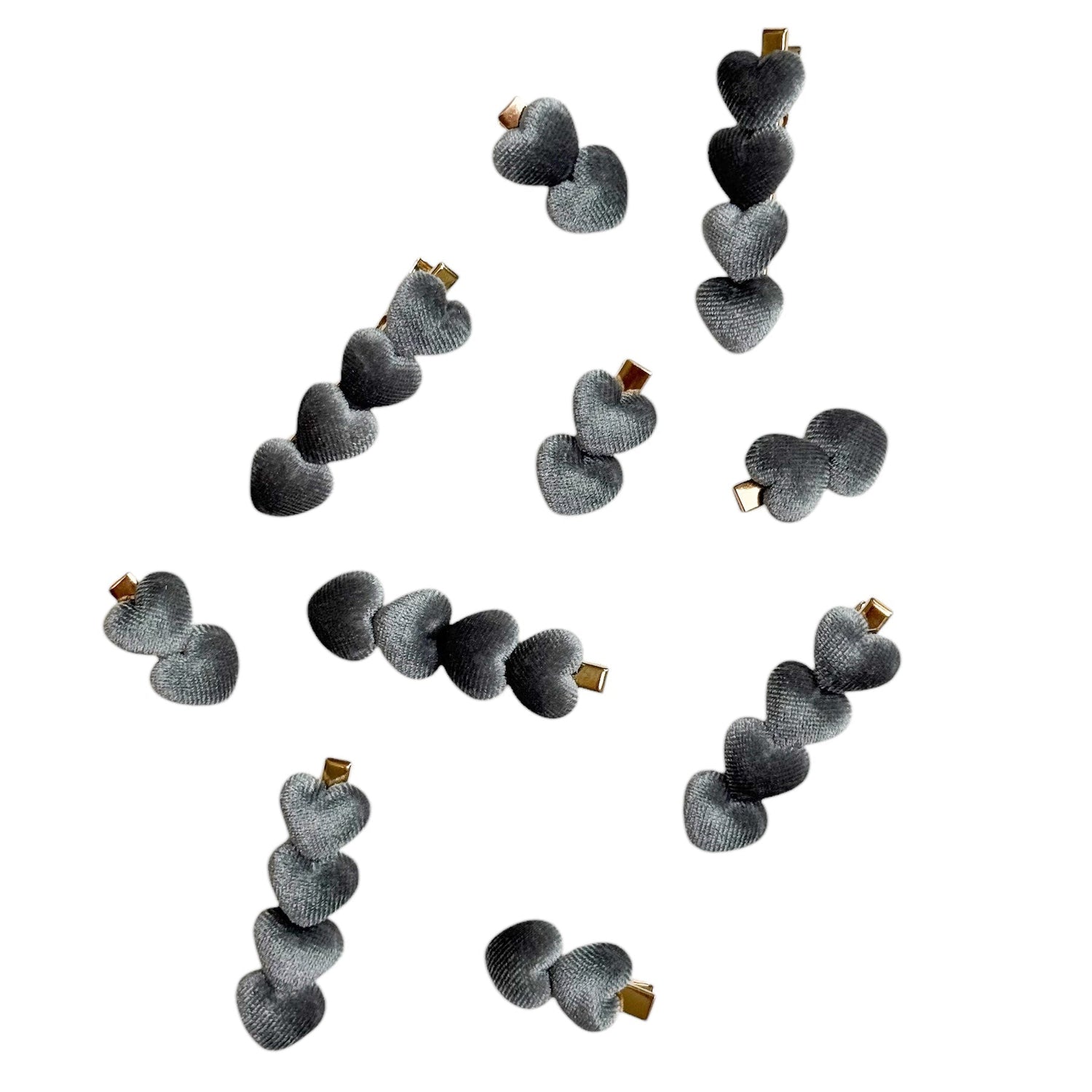 Gray velvet hearts on gold alligator clip.