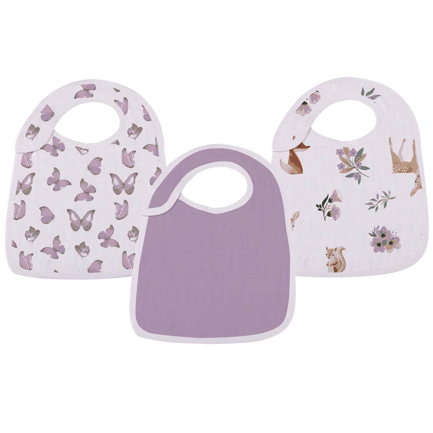 Soft and comfortable 100% natural bamboo muslin. These stylish and easy to care for bibs feature three snaps in the front for a perfect fit. The extra absorbent fabric makes these bibs a must have for feeding and teething.