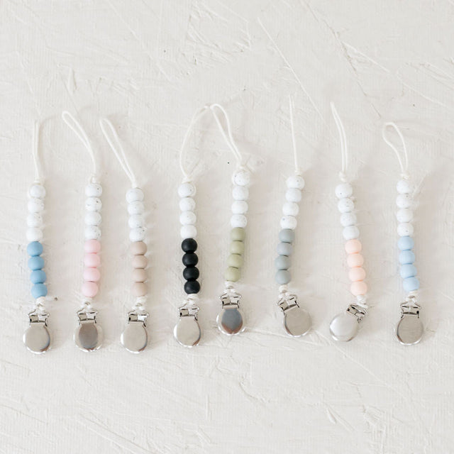 - Made from BPA Free silicone beads, and attached to Lead Free silver clips which have plastic teeth to prevent tearing baby's clothing, while ensuring a firm grip so the pacifier doesn't get thrown or lost.