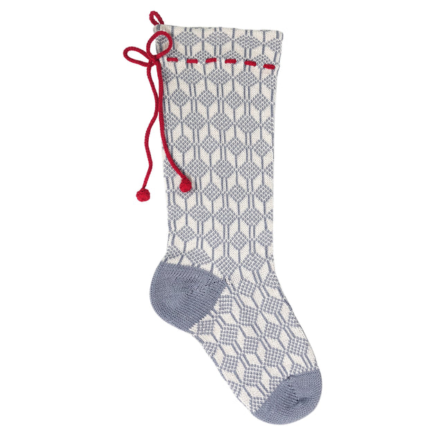 Embrace the elegance of the holiday season with this beautifully crafted knit holiday stocking. Featuring a sophisticated geometric pattern in soft gray and cream tones, this stocking exudes a timeless charm that perfectly complements any festive décor. The subtle, neutral color palette is given a delightful pop of color with the addition of a bright red lace, tied in a bow at the top, adding a touch of festive cheer to the refined design.