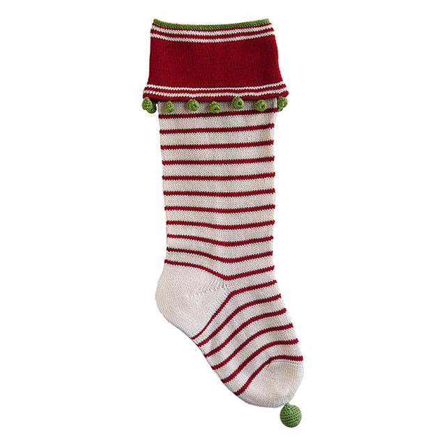 This stocking showcases a delightful cream and red striped pattern that offers a timeless and festive look. The rich red cuff is accented with playful green pom-poms, adding a whimsical touch, while the matching green pom-pom at the toe provides a unique, eye-catching detail.