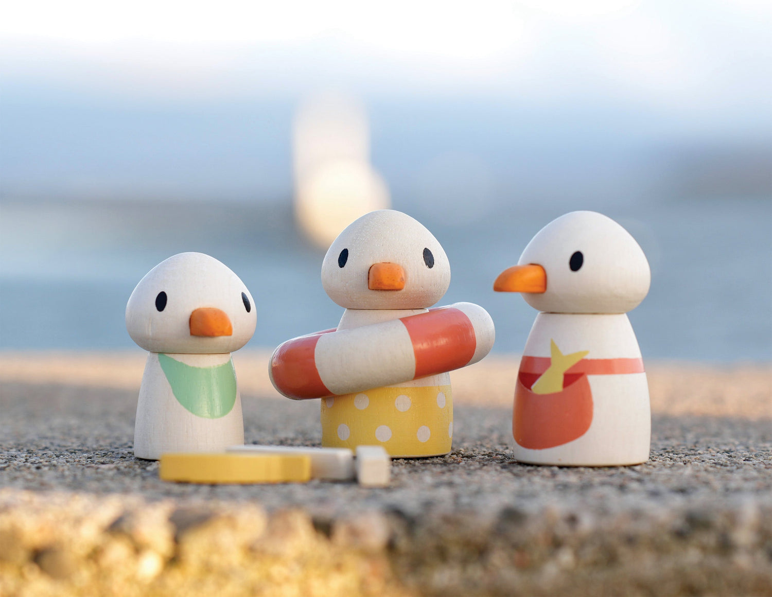 • Seagull Family: Includes Sandy, Gully (complete with a knitted hat and removable wooden ring), and other seagull family members.