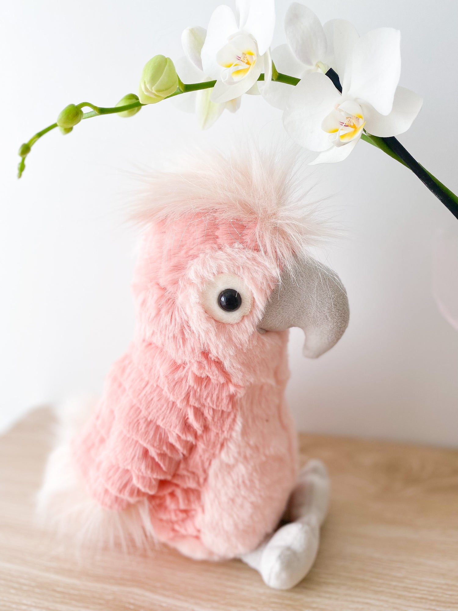 Great for flying about and sharing adventures, Lulu Cockatoo bird plush is full of cuddles. With her pink feathers and blush plume, Lulu is a unique gift certain to bring a smile and tons of fun!