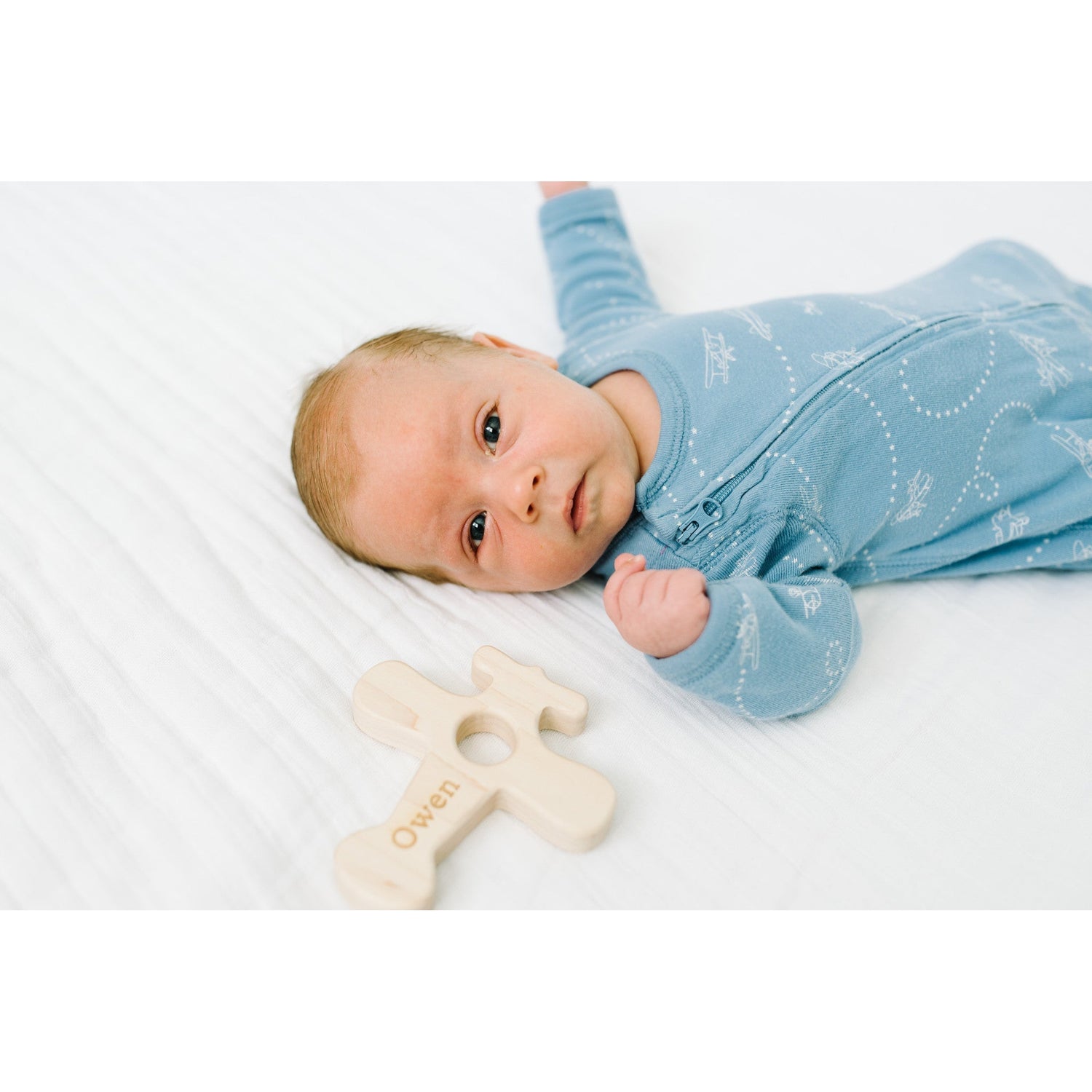 The airplane grasping toy is made using hard maple which is naturally resistant to  bacteria and it is non-splintering wood, so it's safe for baby to play with for hours!  Its lightweight and easy to hold, working on all those gross motor skills that are so important early on!