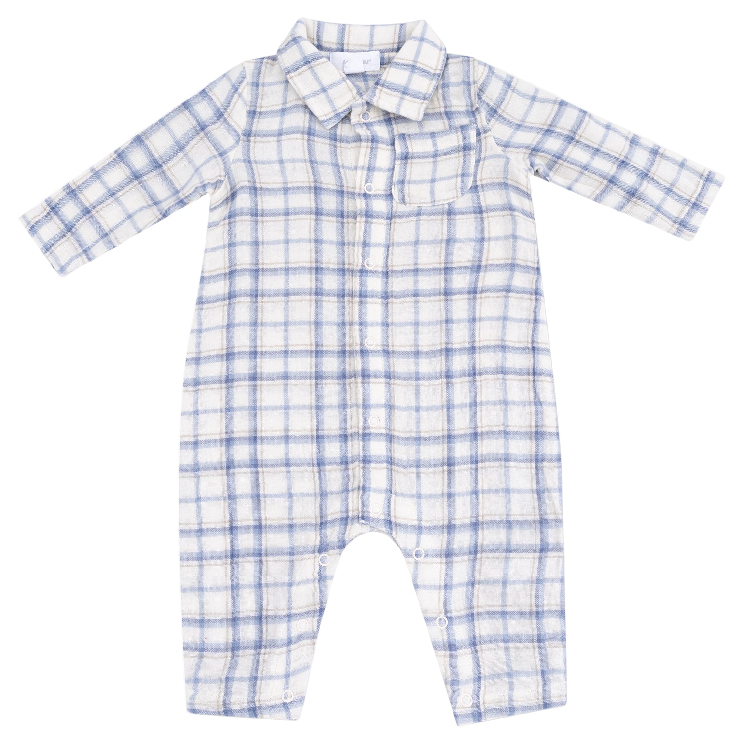 Long Sleeve Polo Romper with Full Placket - Blue Plaid