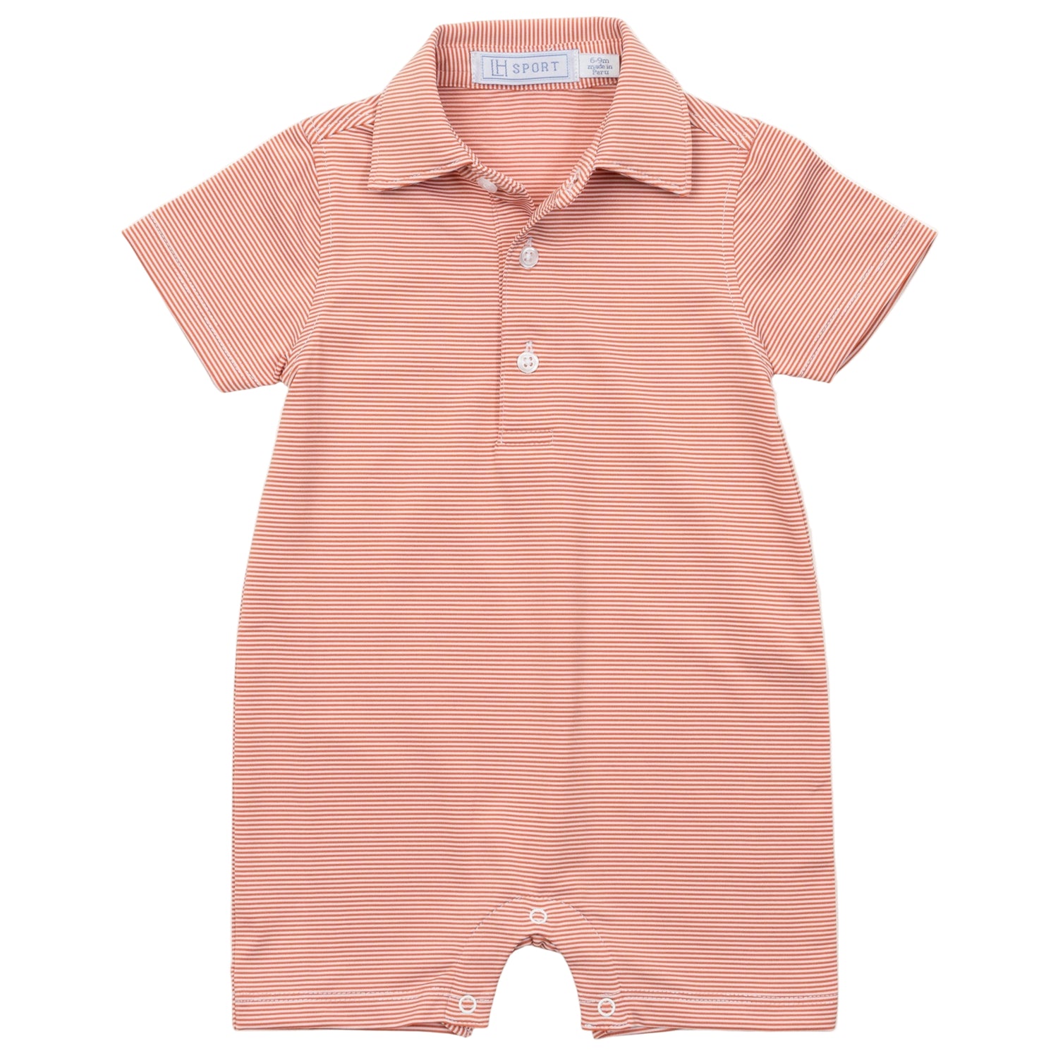 Short sleeve performance polo-style shortall with button front and three snap closure in stride. Coordinates perfectly with the Will golf shirt for the older boys. Made from 92% polyester, 8% Elastane. Moisture-wicking and quick-drying.