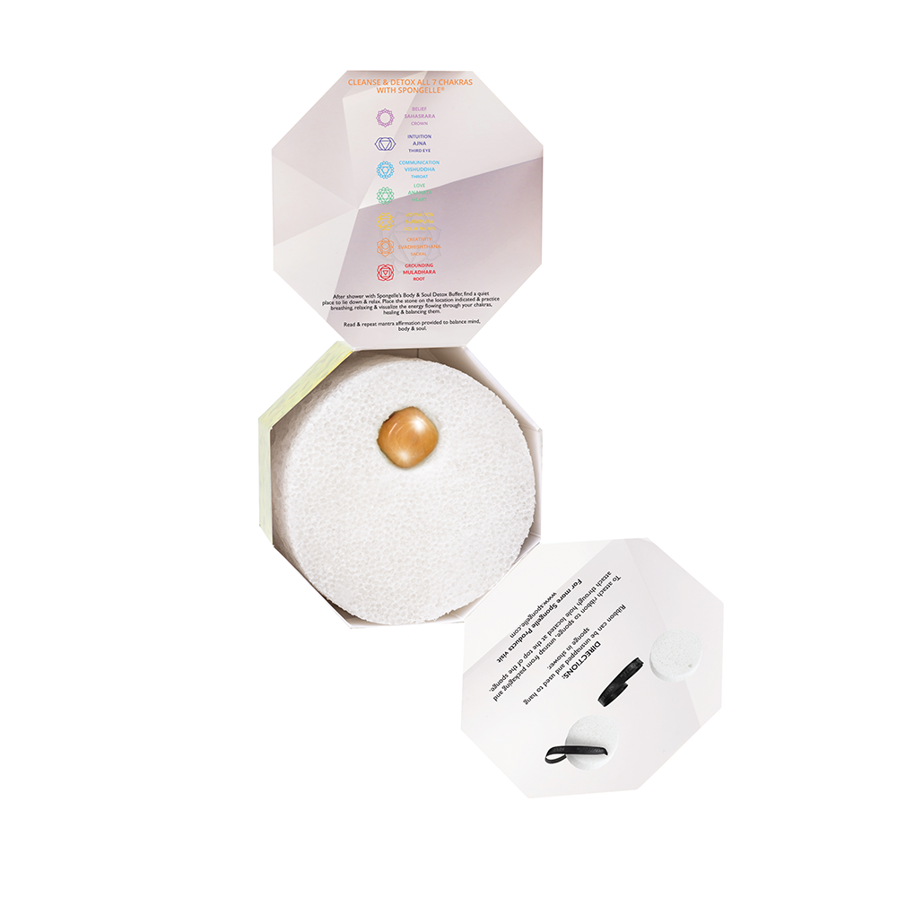 Nestle into a detoxifying and de-stressing cleansing experience with the Spiritual Detox Collection—complete with mood-enhancing Chakra Stone. Unleash Spongellé’s® creamy fragrance by placing the soft body wash-infused buffer under running water to reveal silky aromatic cleansing. Use the textured exfoliating side to gently polish away dead skin. Botanical science and patented technology ensures a minimum of 22+ washes.