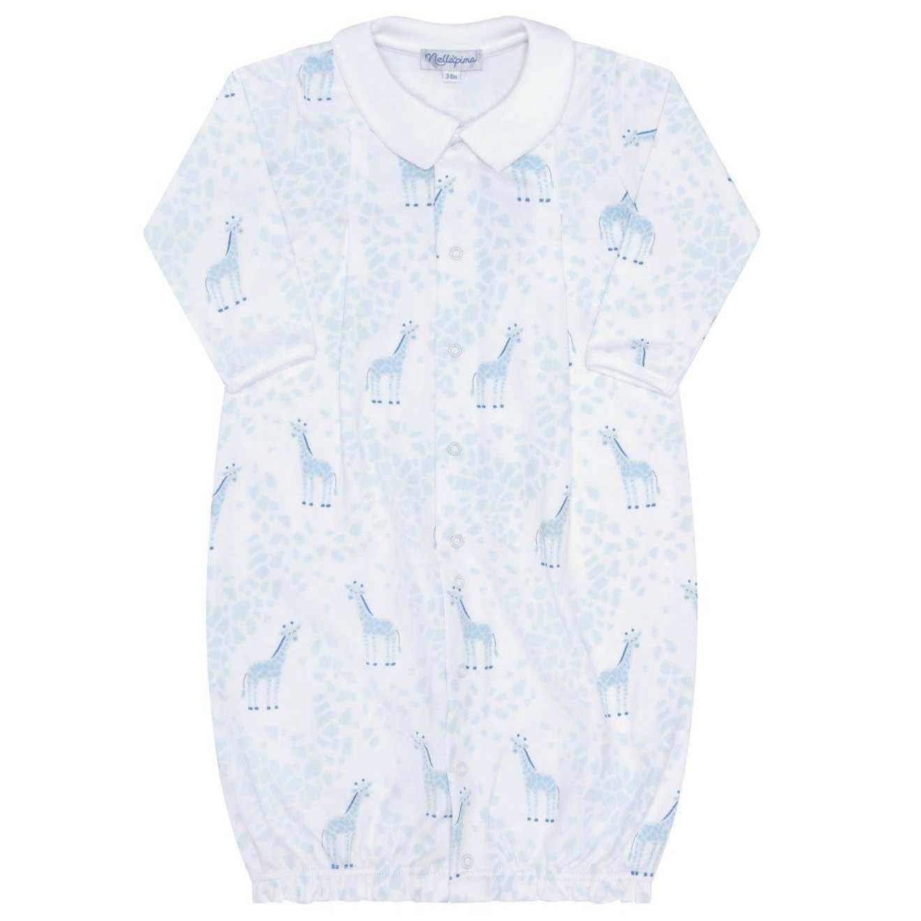 The Blue Giraffe Print baby converter gown is a true game-changer for parents! It allows for a quick and effortless transition from a cozy gown for sleepy time to a practical playsuit for playtime, simply by changing the snaps.