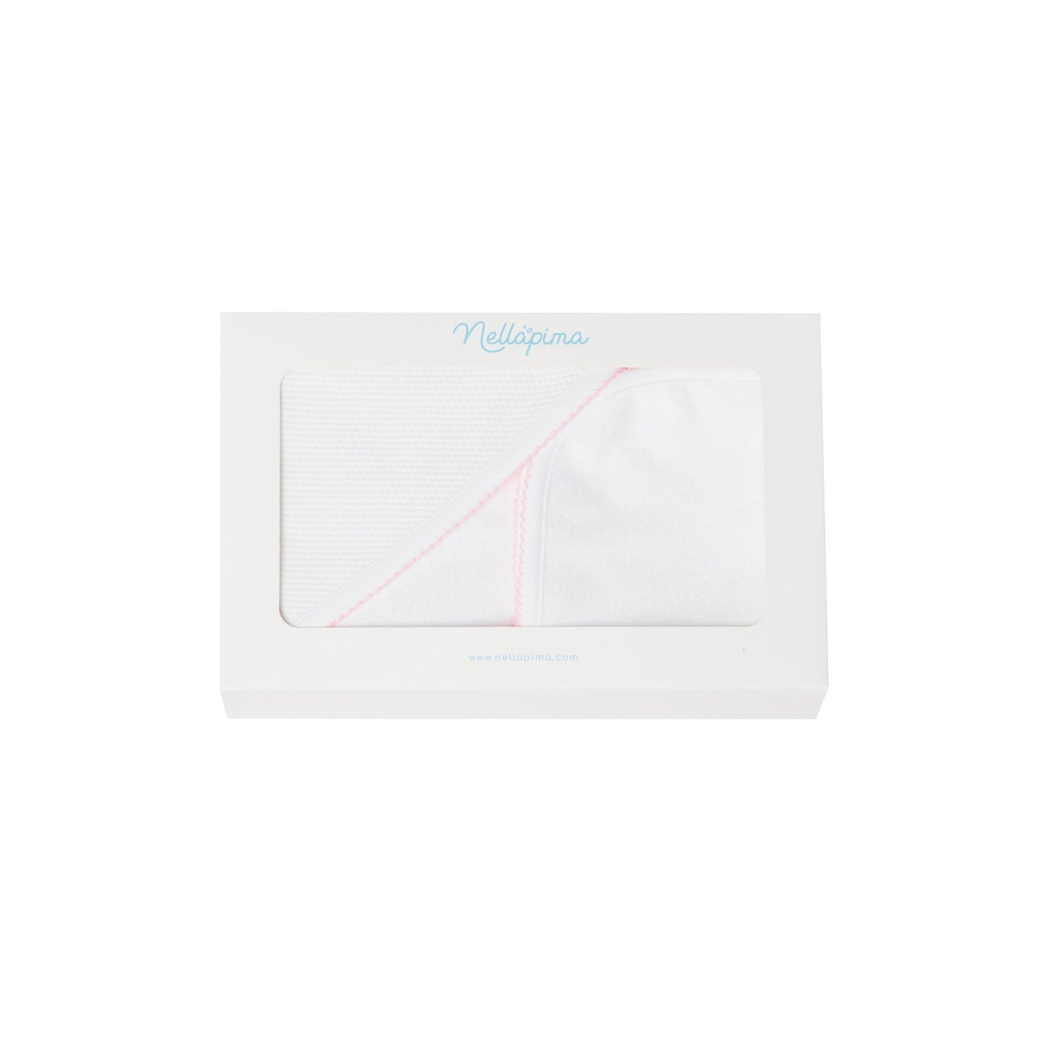 Crafted from premium 100% Peruvian cotton, this set features a pima cotton applique hood made of exquisite White Bubble fabric, and adorned with Picot Trim details in either Pink or Blue, adding a touch of elegance to bath time.