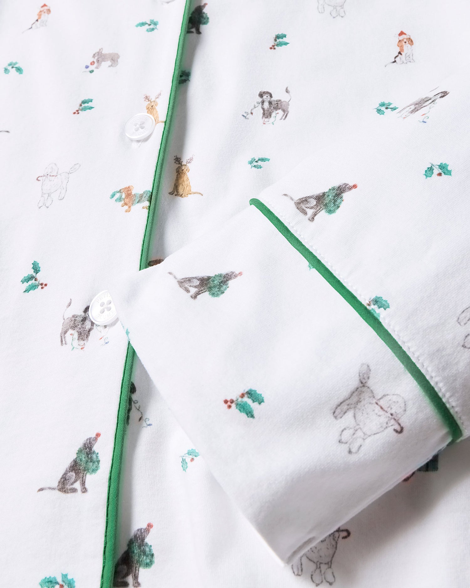 Honor your four-legged friends with this lighthearted winter design, featuring canines in their holiday finest. Candy cane-carrying poodles and wreath-wearing labradors add a playful touch to traditional sleepwear.