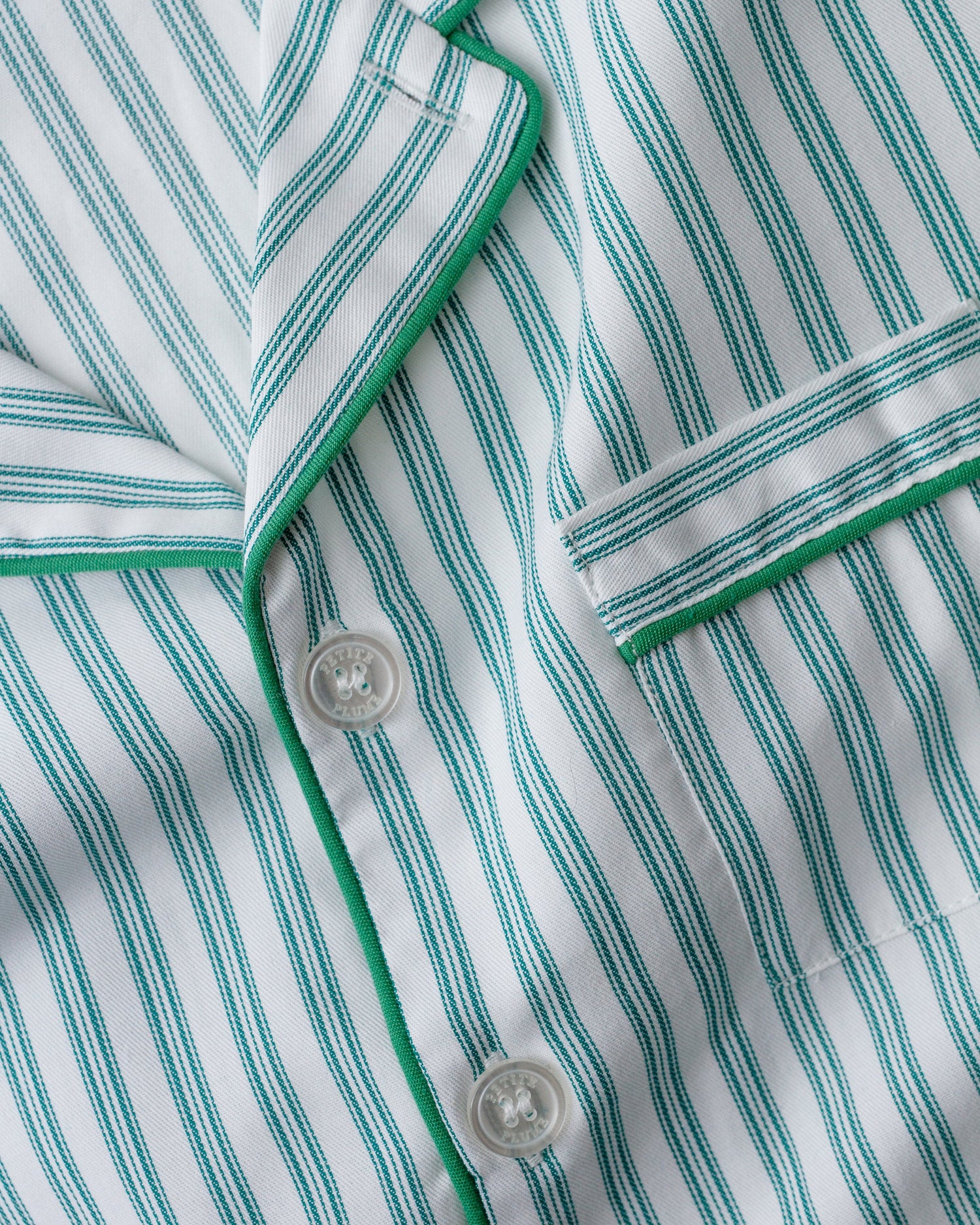 Our classic French ticking pattern takes on a new seasonal hue in a lush, deep green that channels the color of evergreen trees. The versatility of this print allows seamless transition from bedtime to holiday festivities in a snap. This classic twill pajama set is accented with green piping and finished with logo buttons.
