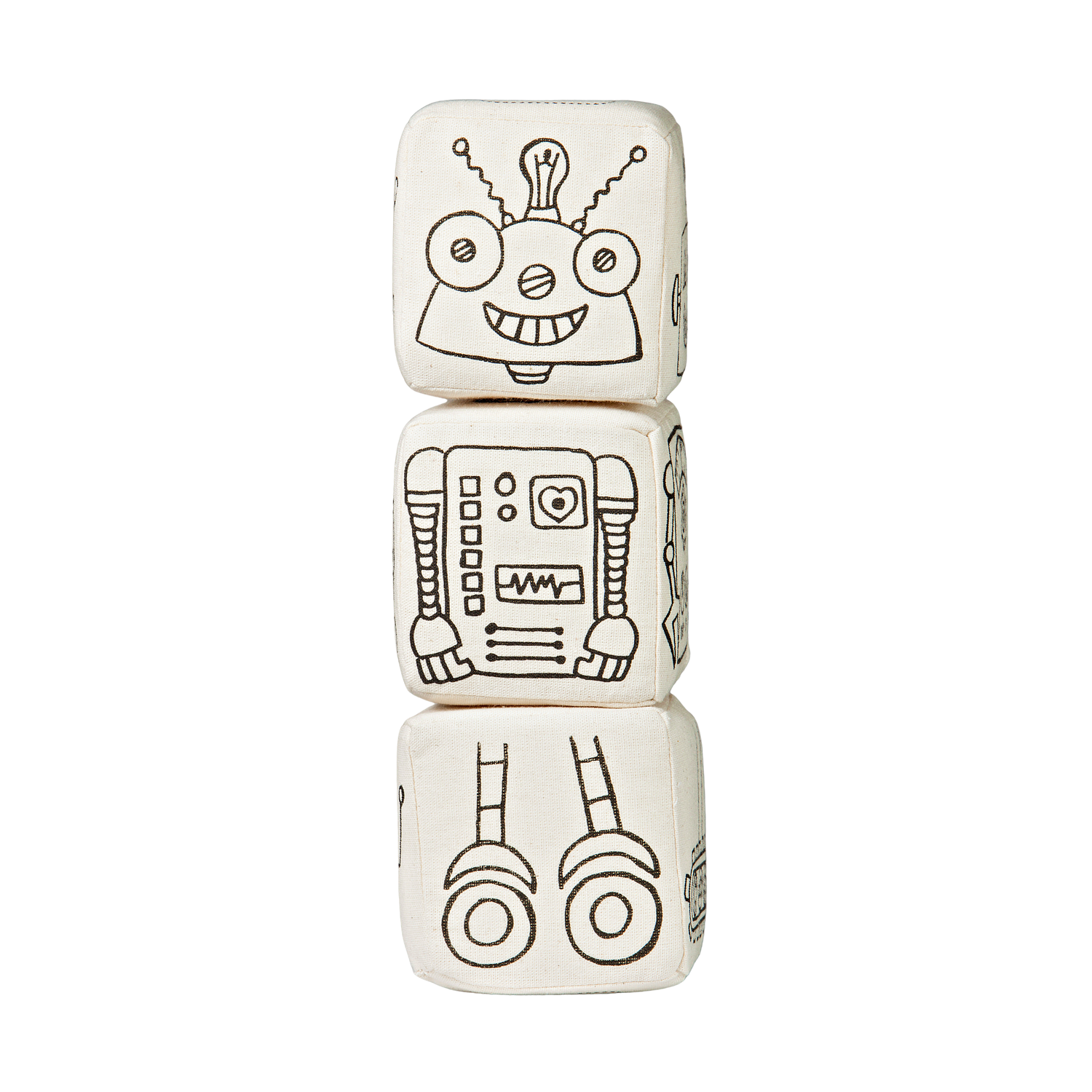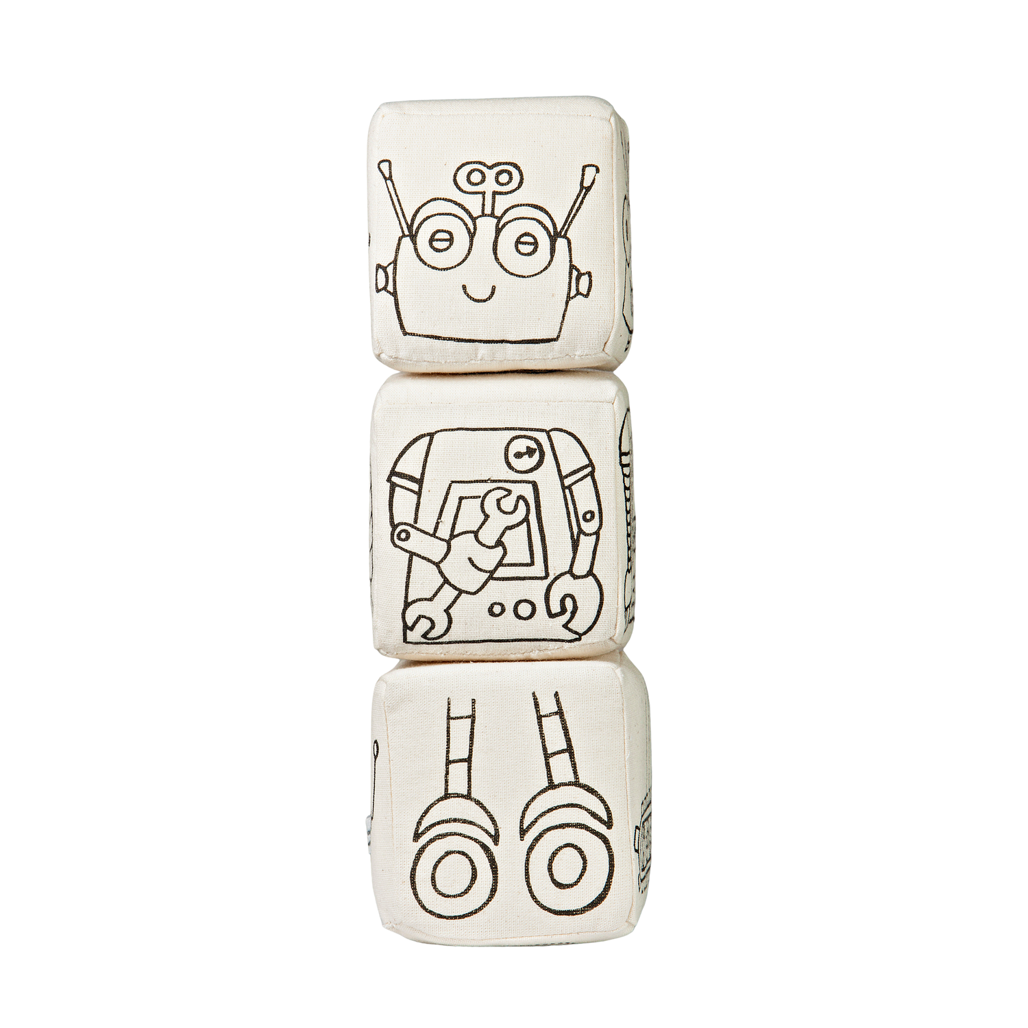 The blocks are approximately 10 1/2 inches high (when stacked), and each side has approximately 3 1/2 inches. It comes with 4 assorted colors of Washable Markers, so kids can start coloring right out of the box.