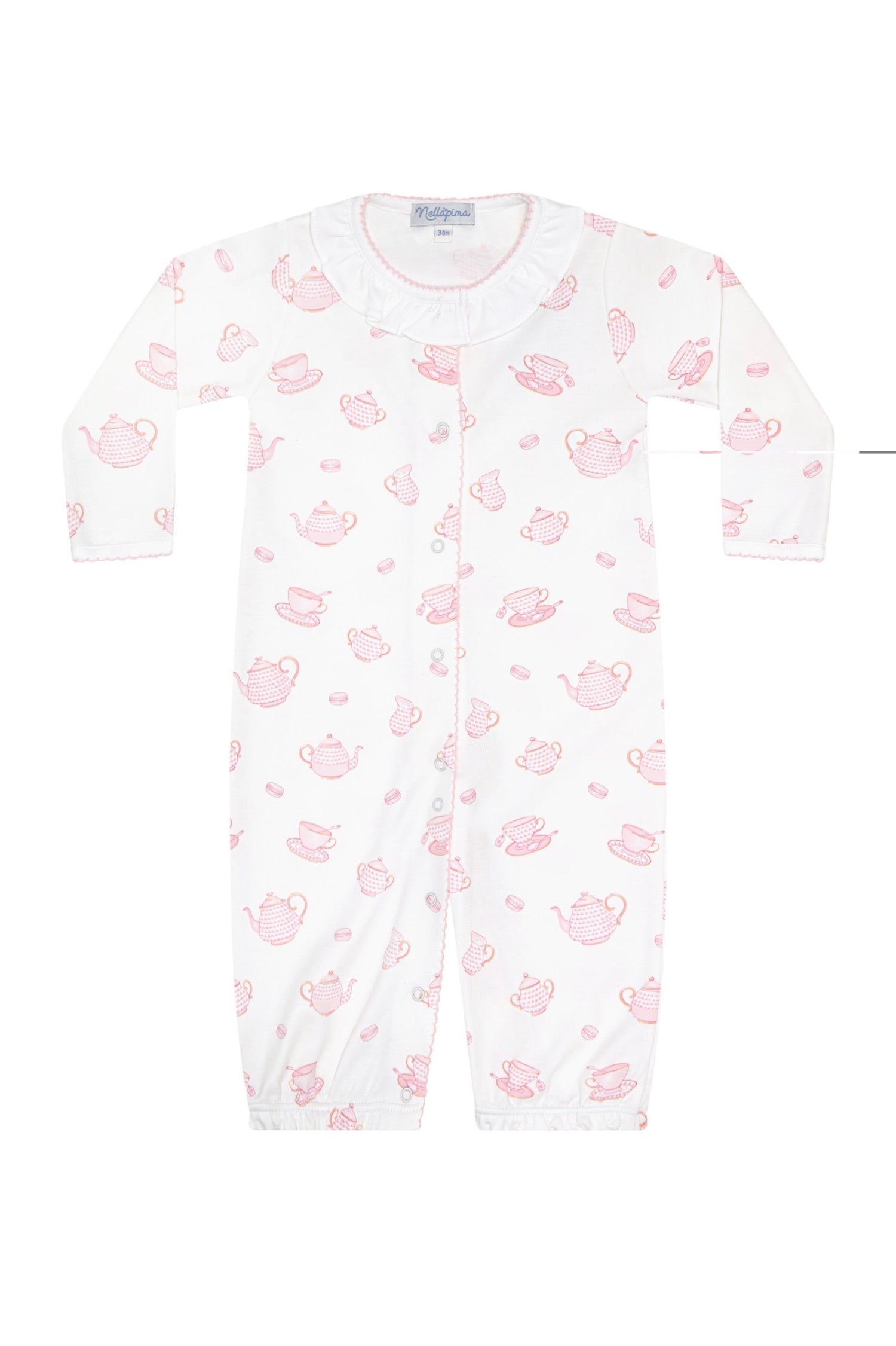 This versatile piece converts from a gown to a romper, offering flexibility and comfort throughout the day and night. Made of the finest Pima cotton and printed with delicate tea sets and sweets, it’s a functional beauty. Snaps at the bottom allow for quick changes, and the elastic hem ensures ease for both parents and babies.